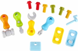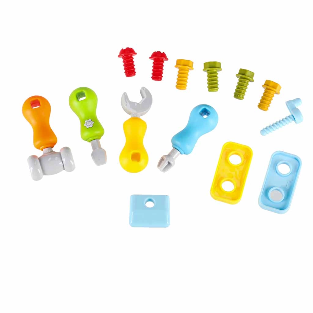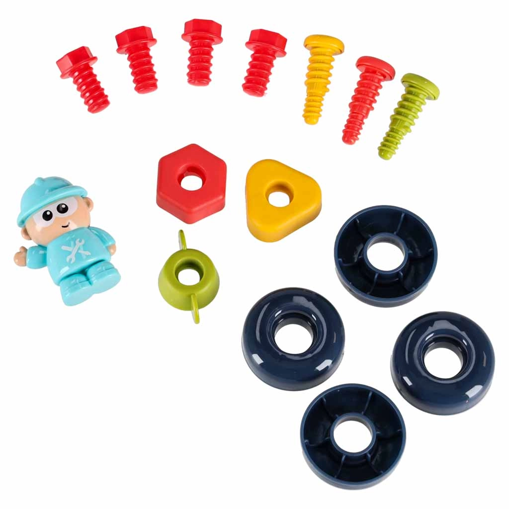 El conjunto incluye tornillos, tuercas, engranajes, destornilladores, llave y martillito. Los niños entrenan la precisión y la coordinación al fijar piezas y practicar con formas.