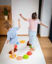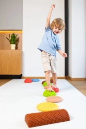 El camino sensorial de equilibrio en suaves tonos pastel es ideal para niños y adultos en el desarrollo del equilibrio, la estabilidad y la percepción espacial. Las superficies variadas —desde relieves suaves hasta puntos de masaje más pronunciados— ofrecen una rica estimulación táctil de la planta del pie y ayudan a mantener una postura corporal adecuada.