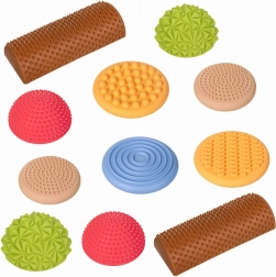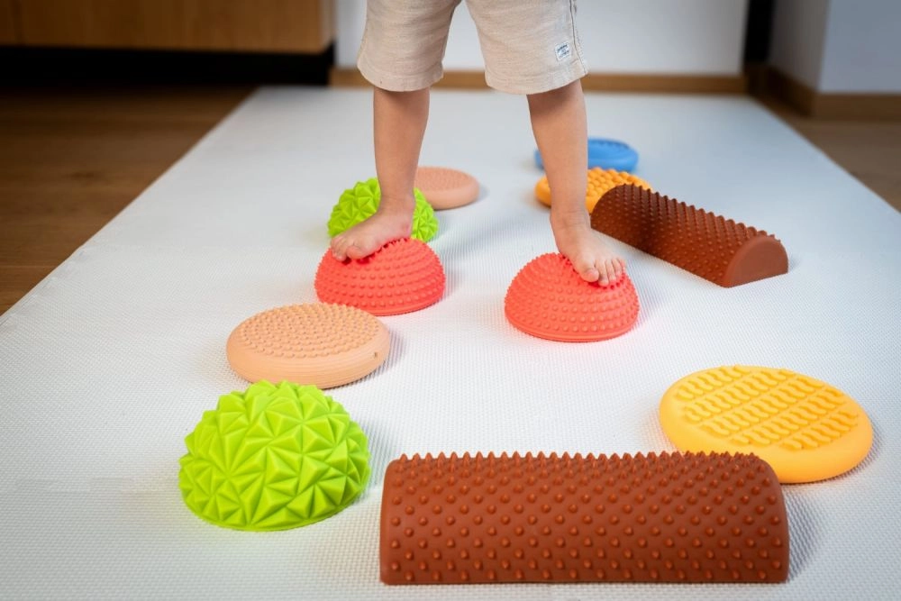 El set incluye una combinación de cúpulas, discos y semicírculos que pueden colocarse libremente en líneas rectas o circuitos de juego. Gracias a su estructura firme pero flexible y al acabado antideslizante, las piezas son seguras sobre suelos lisos y esterillas de ejercicio. Adecuado para ejercicios en casa, guarderías, escuelas, fisioterapia e integración sensorial.