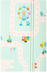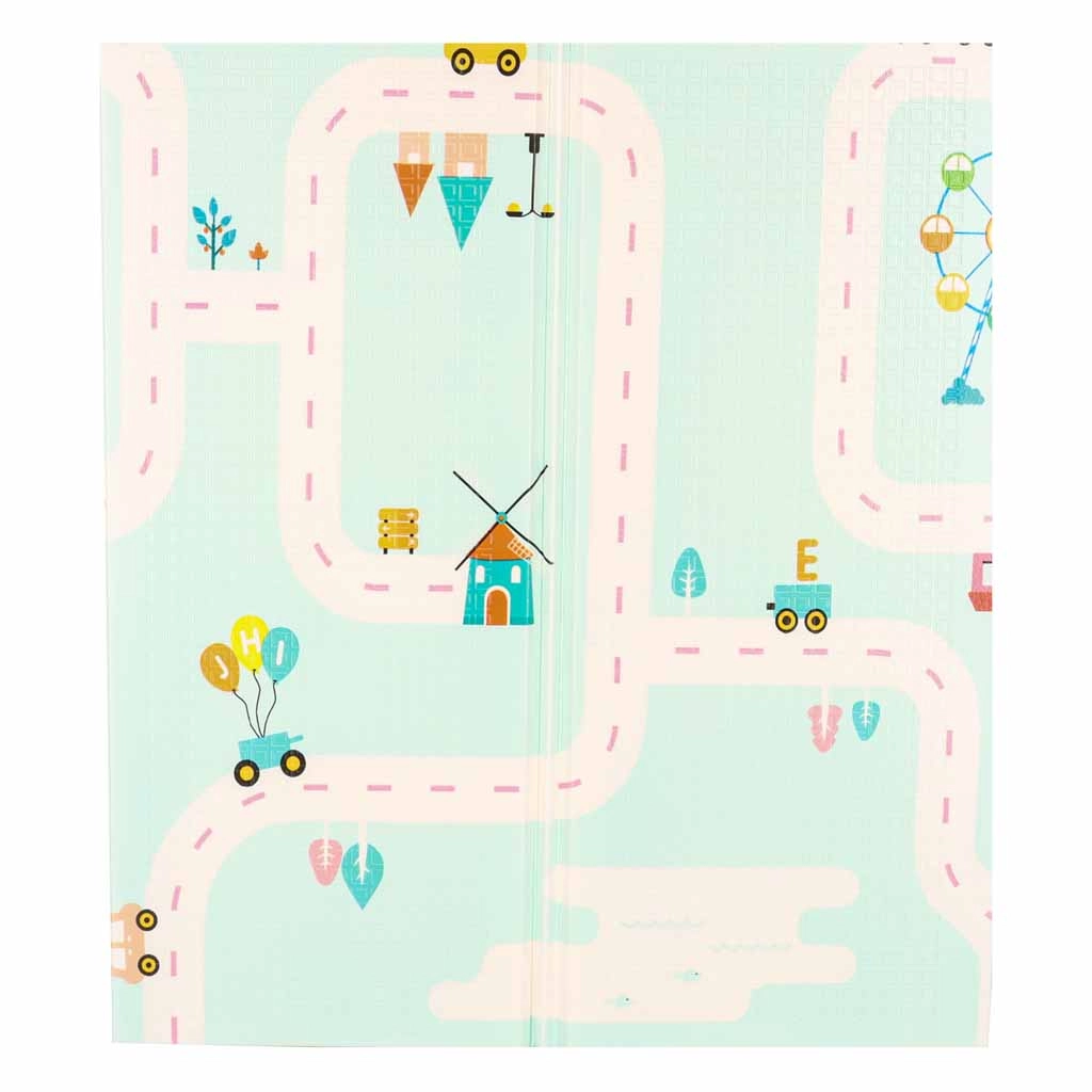 Tiernas pandas en un lado y un motivo de carreteras en el otro fomentan la imaginación, el aprendizaje y la diversión con coches y construcciones.