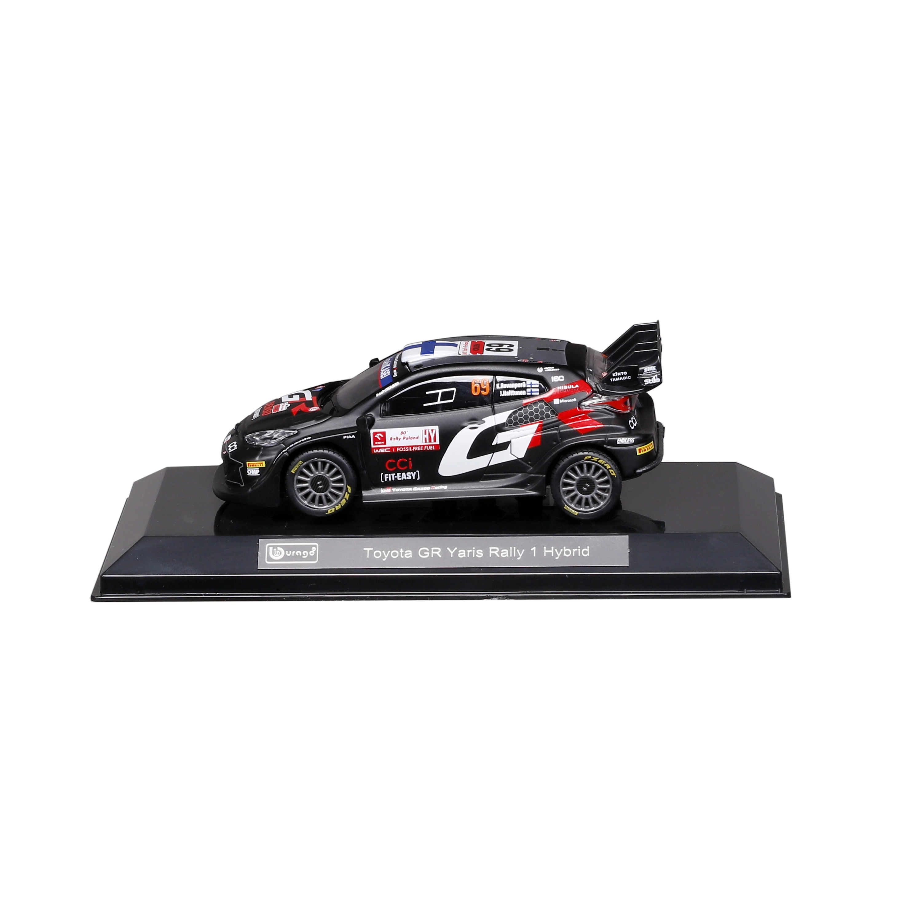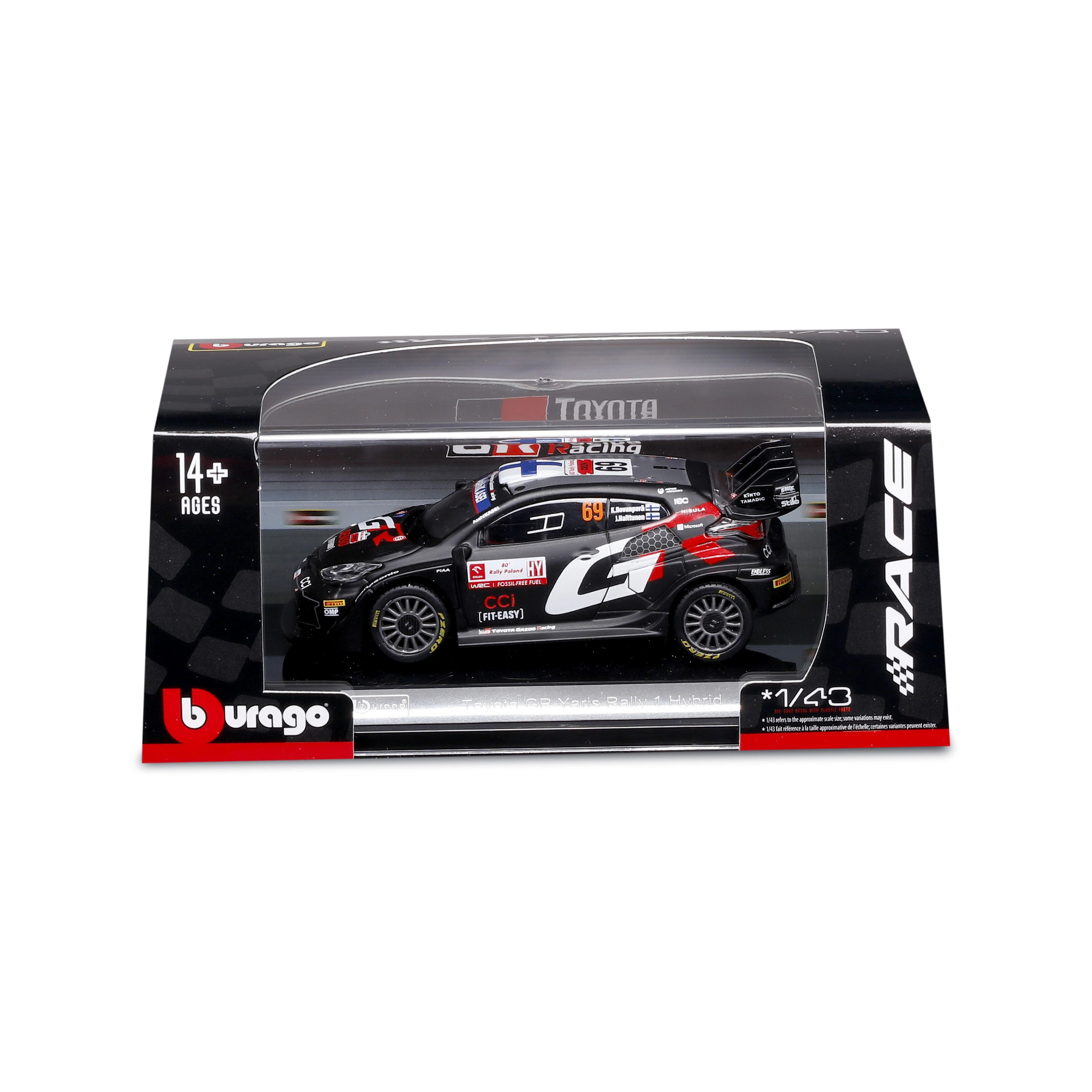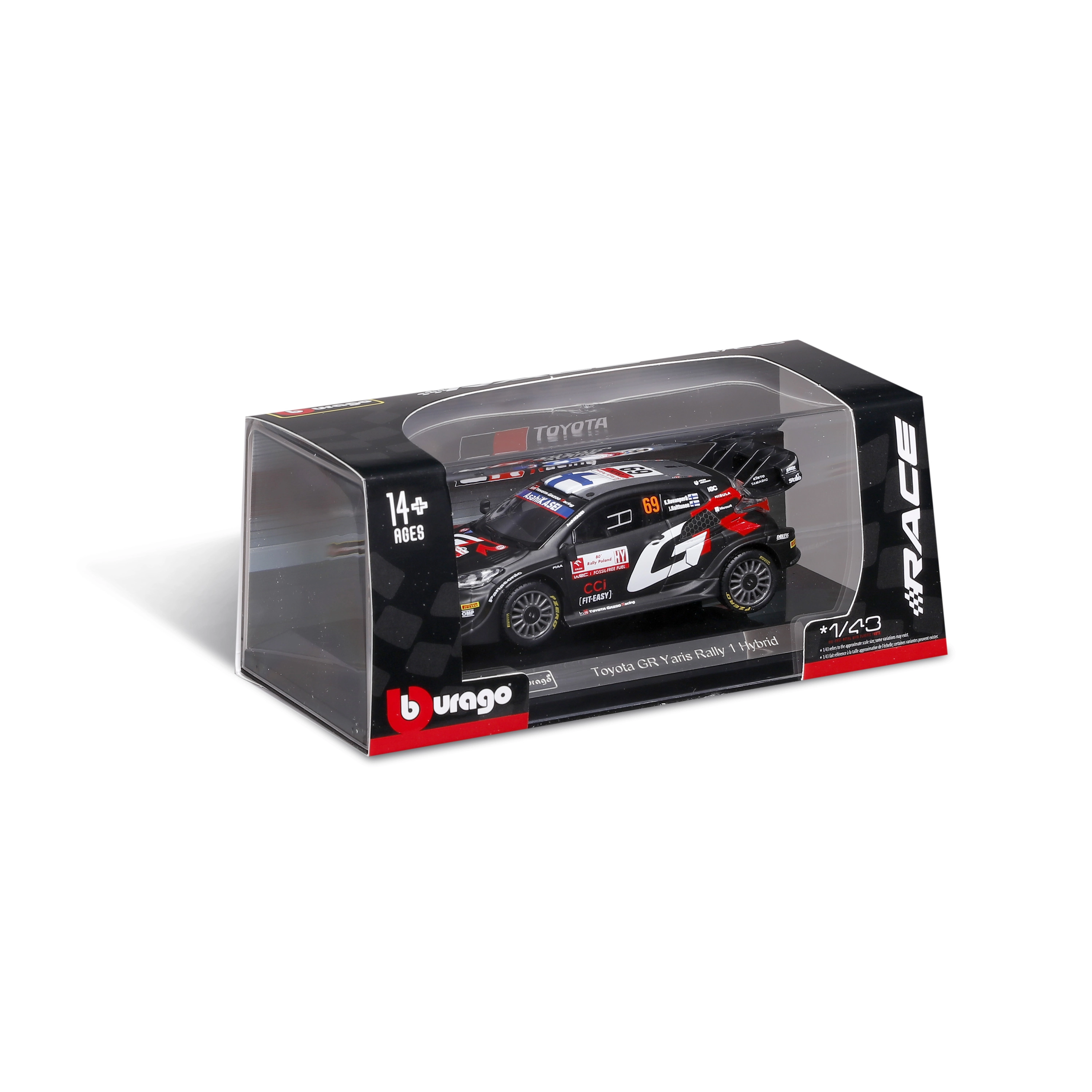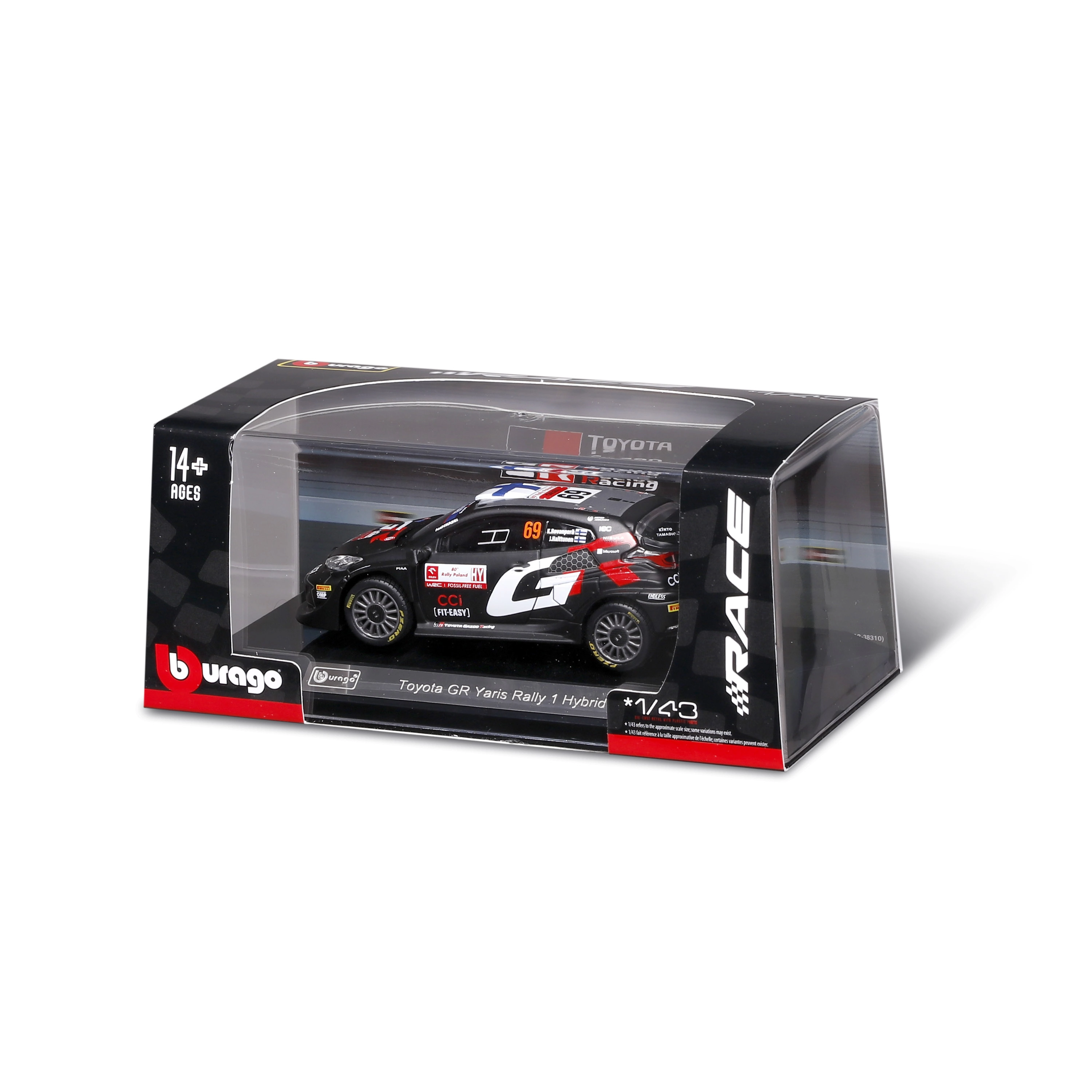 El modelo de coche de colección Bburago a escala 1:43 reproduce fielmente el TOYOTA GR YARIS RALLY1 HYBRID con el número 69. Ofrece impresiones detalladas de patrocinadores, elementos aerodinámicos y ruedas que giran libremente, ideal para exposición y juego ligero en una caja de regalo de calidad con ventana expositora.