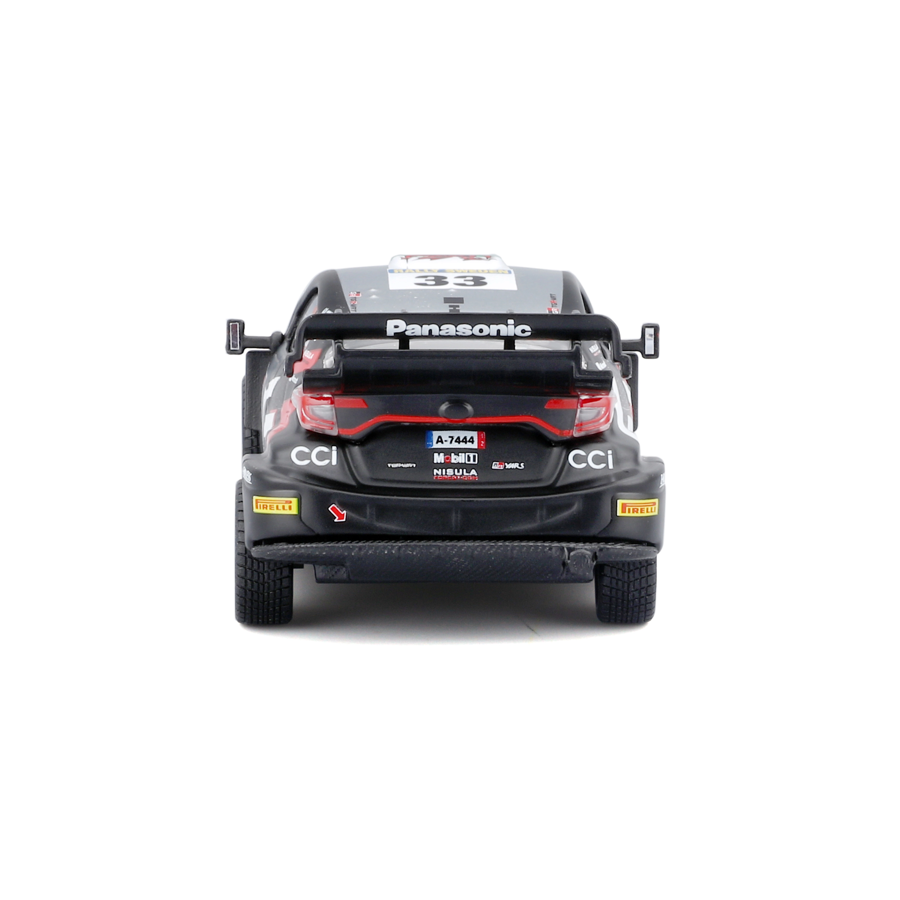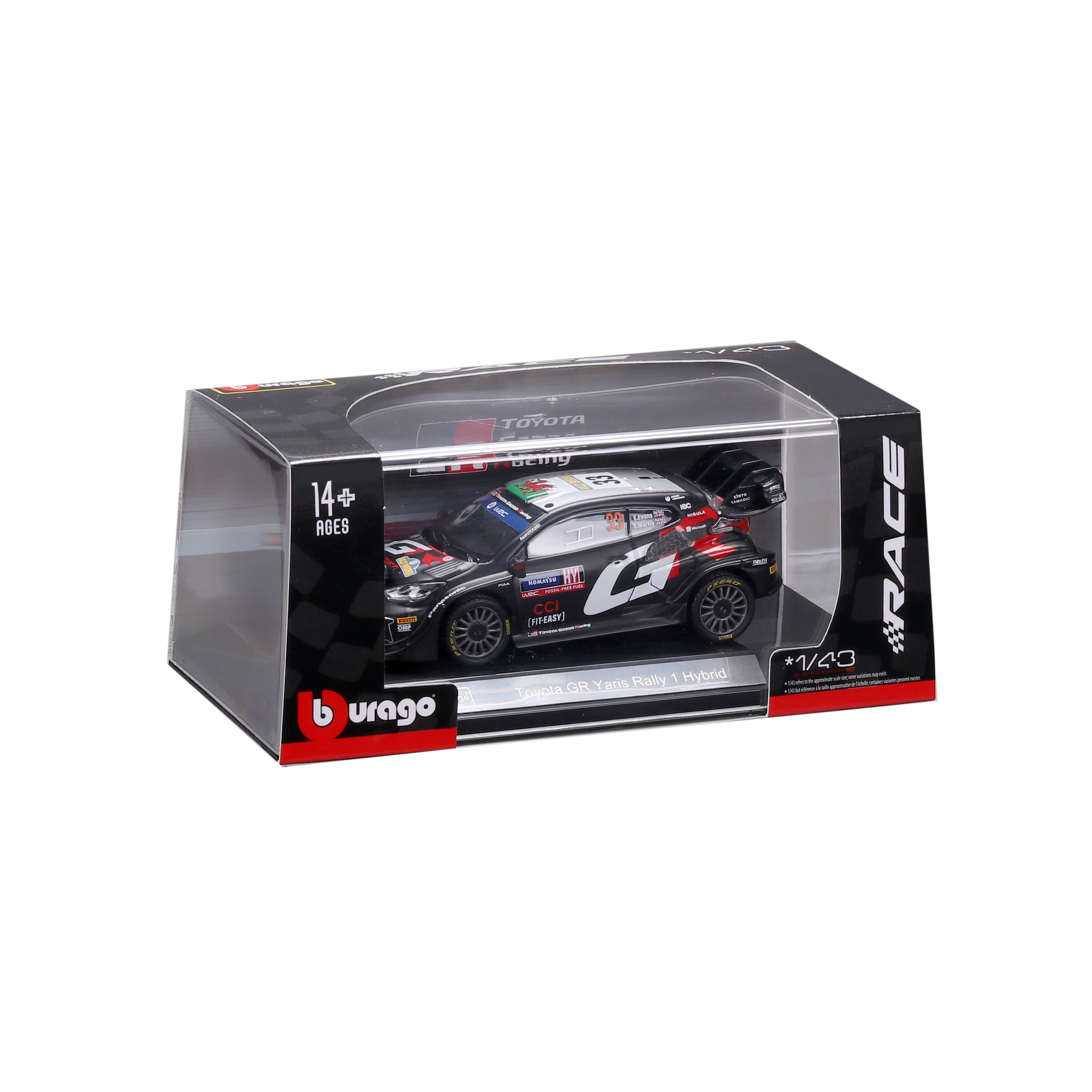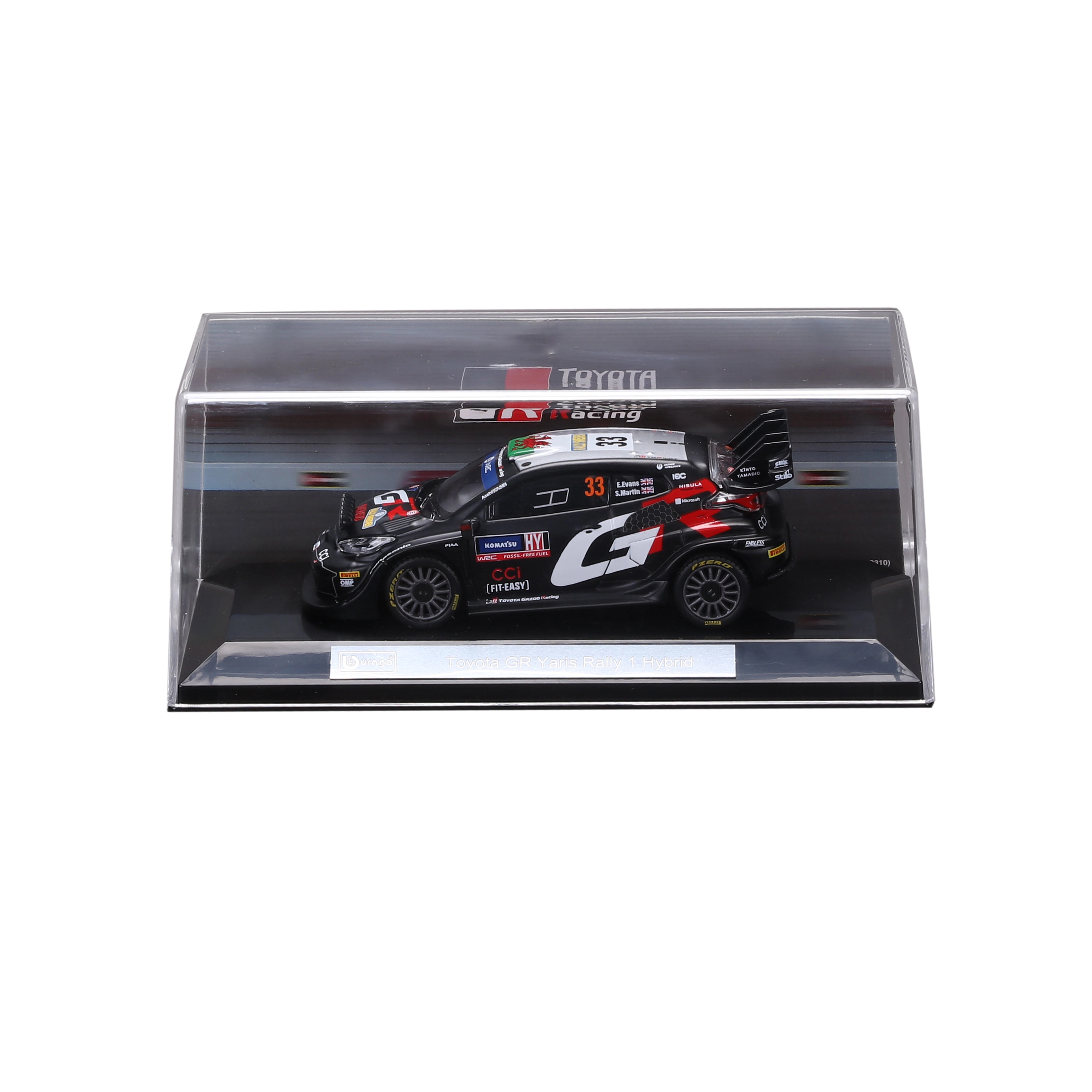 Disfruta de la atmósfera del rally mundial con el detallado modelo de colección Bburago a escala 1:43, que reproduce fielmente el Toyota GR Yaris Rally1 Hybrid con el número 33 en los colores de TOYOTA GAZOO Racing. El modelo destaca por elementos realistas como luces adicionales de rally, un prominente alerón trasero y precisas calcomanías del equipo.