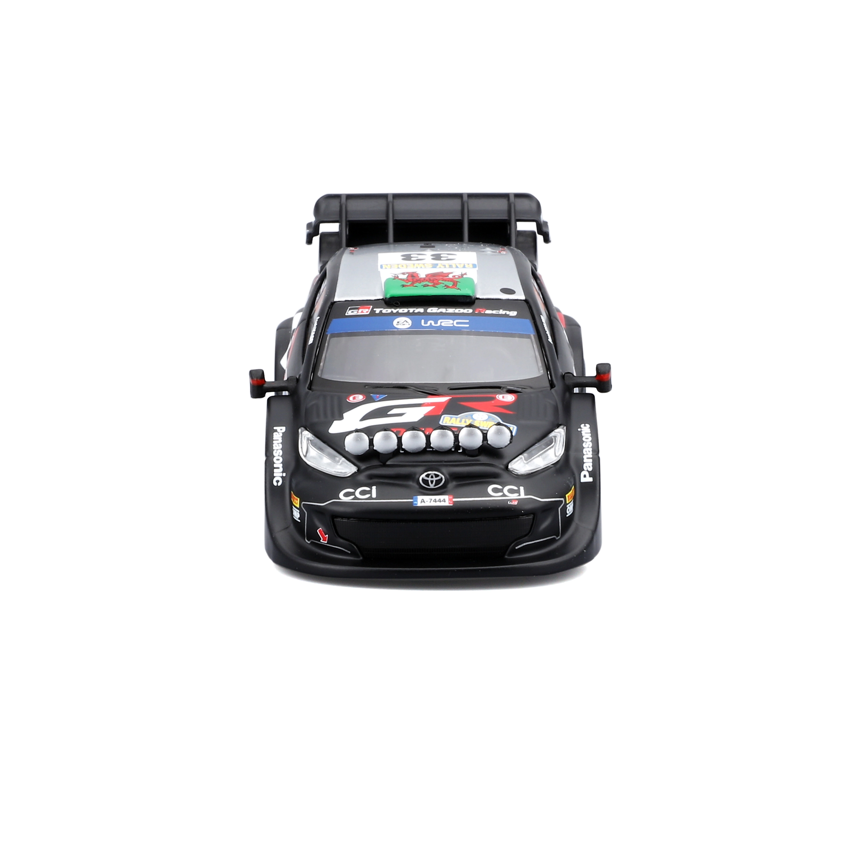 Calcomanías detalladas, luces adicionales y elementos aerodinámicos corresponden exactamente al verdadero especial de competición Toyota GR Yaris Rally1.