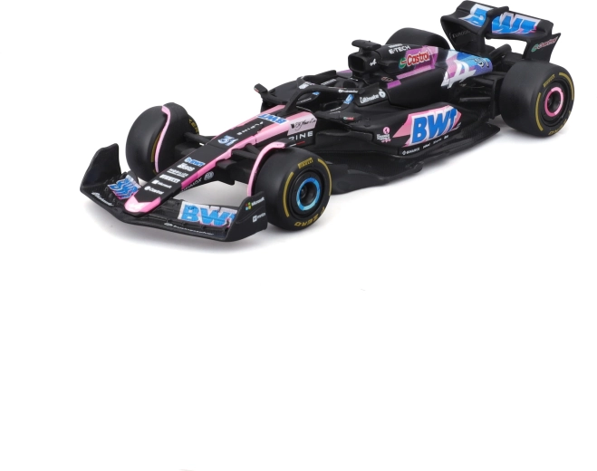 Colores fieles de BWT con acentos rosas y azules, logotipos precisos y detalles de competición para un aspecto realista en la vitrina.