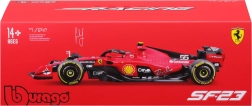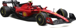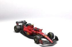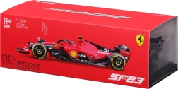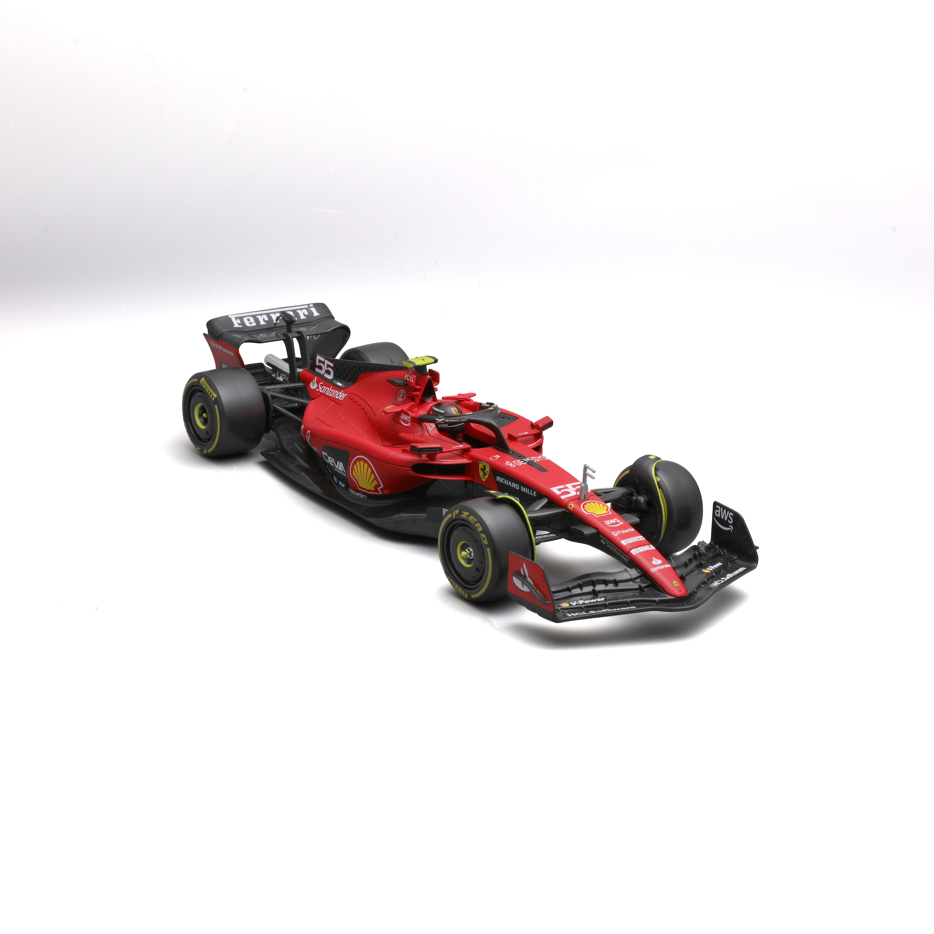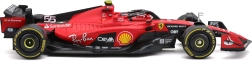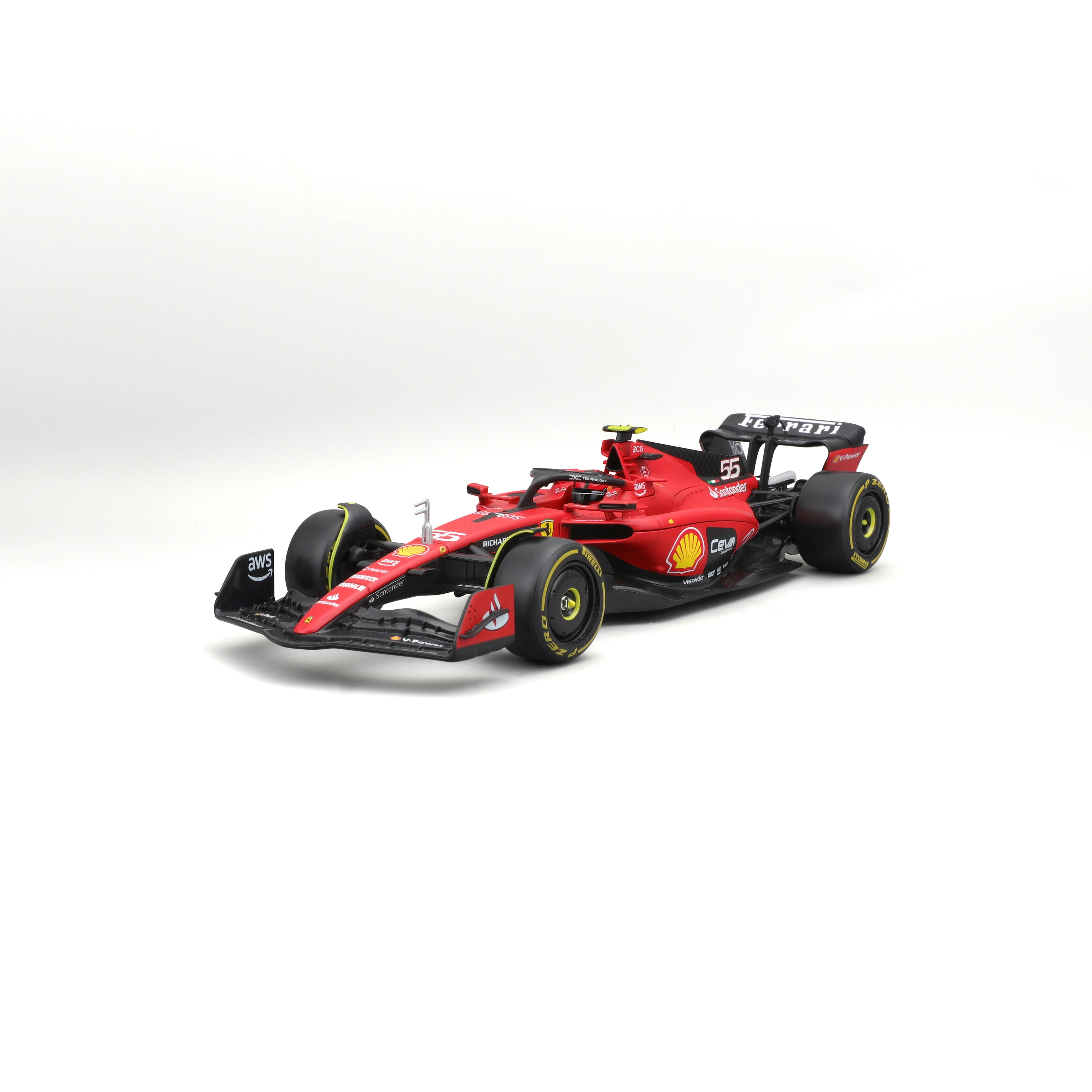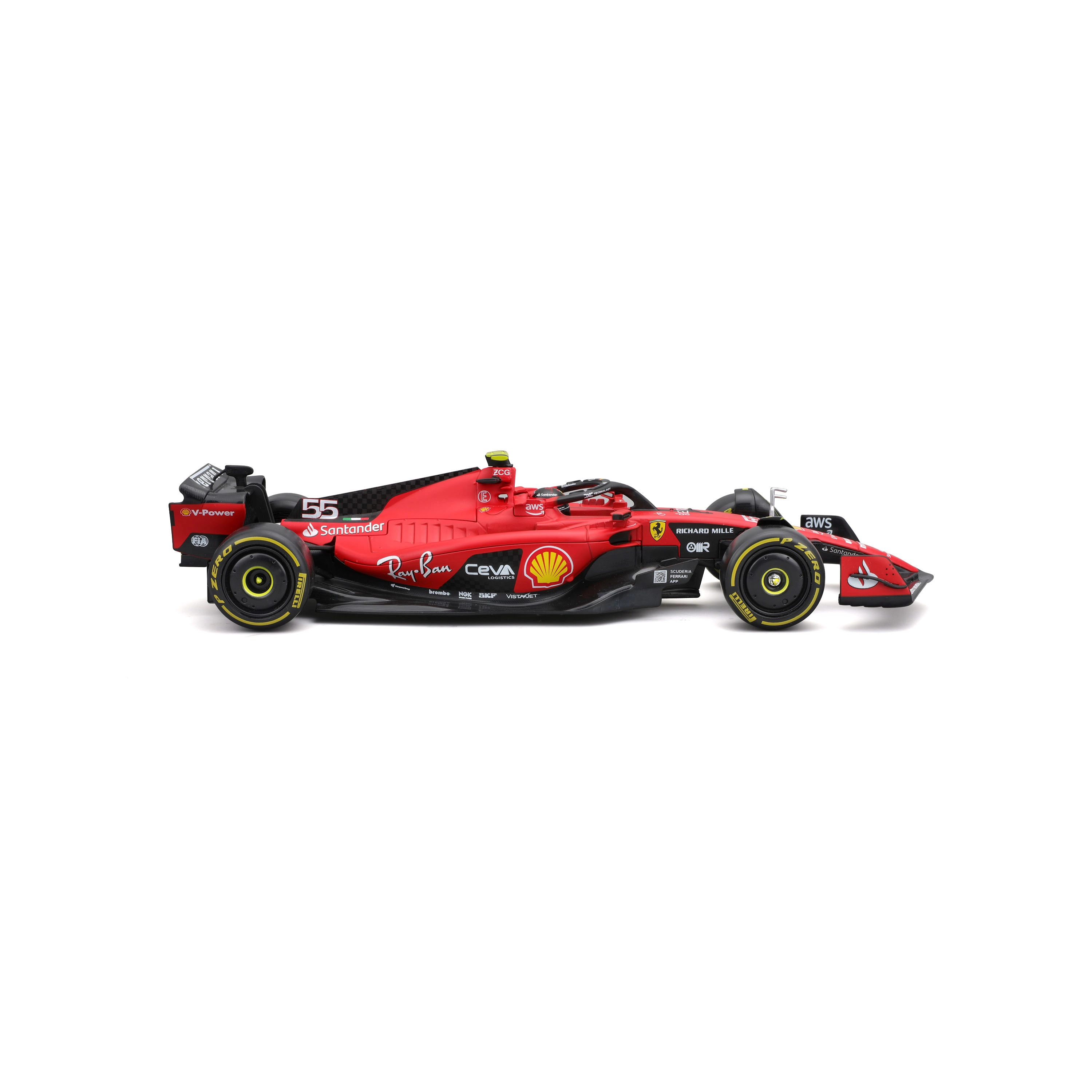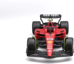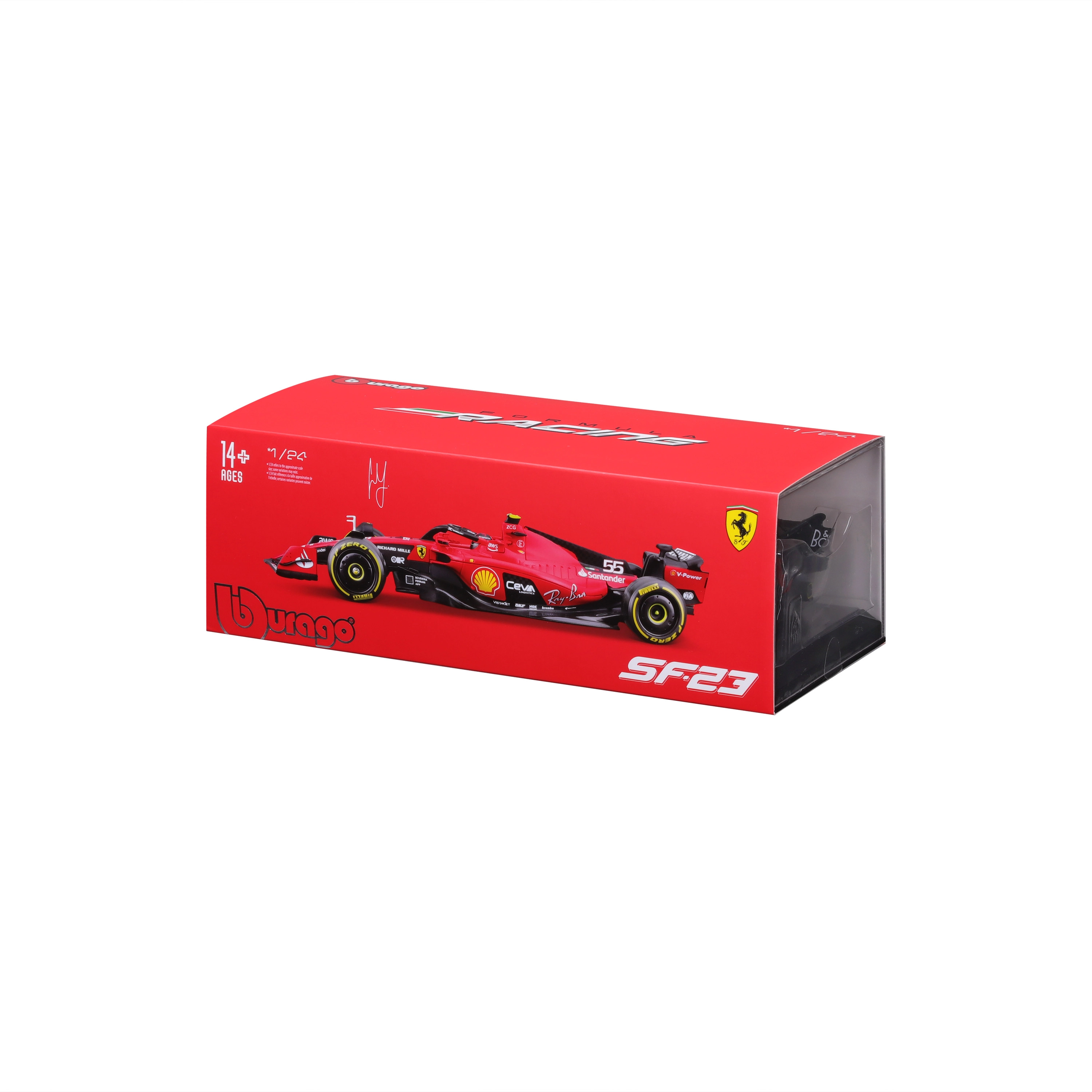 Detalle del modelo de coleccionista del monoplaza FERRARI SF23 a escala 1:24 de la marca Bburago, que ofrece un aspecto auténtico del coche número 55 del piloto Carlos Sainz. Acabado preciso, aerodinámica fiel, ruedas giratorias e impresión de alta calidad de los logos de los patrocinadores, complementado por una caja rígida protectora para una exposición segura en vitrina.