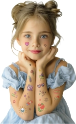 Un alegre set de tatuajes temporales para niños que ofrece hasta 60 diseños diferentes: corazoncitos, estrellitas, flores, lunas y otros motivos de fantasía. Los tatuajes son fáciles de aplicar, seguros para la piel infantil y duran 3–5 días. Se pueden lavar fácilmente con jabón y agua tibia, ideales para fiestas, cumpleaños o juegos temáticos.