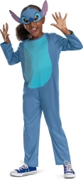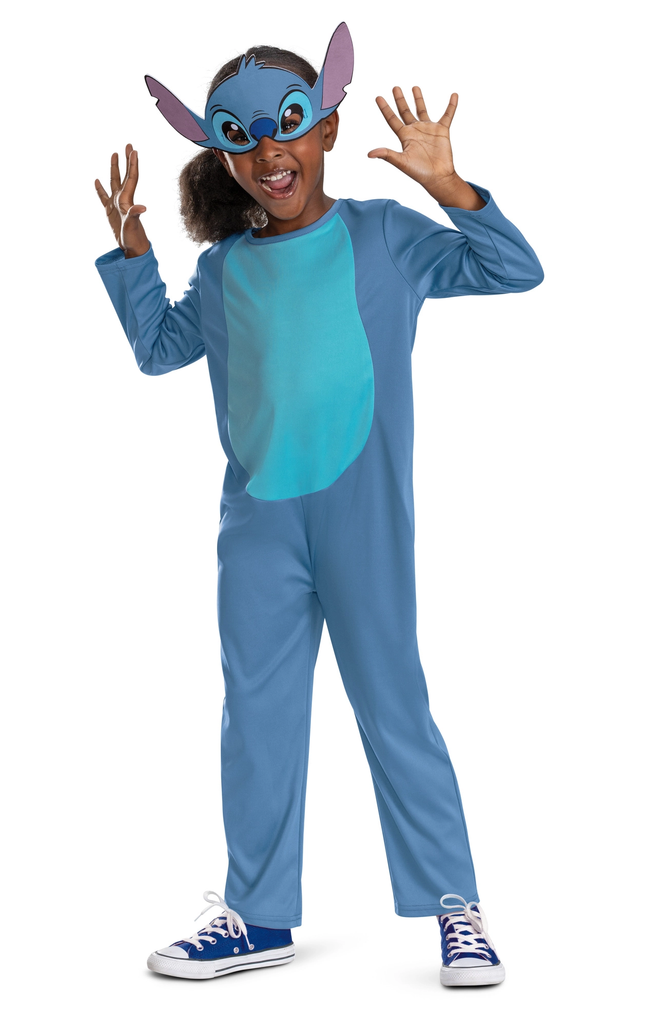 El mono azul con panel abdominal claro y la característica máscara reproducen fielmente al querido personaje de Lilo & Stitch.