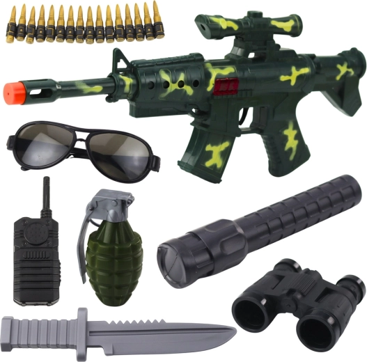 El set incluye granada, cuchillo, prismáticos, linterna, walkie‑talkie, gafas y cinturón con cartuchos: todo para escenarios realistas y el desarrollo de la imaginación.