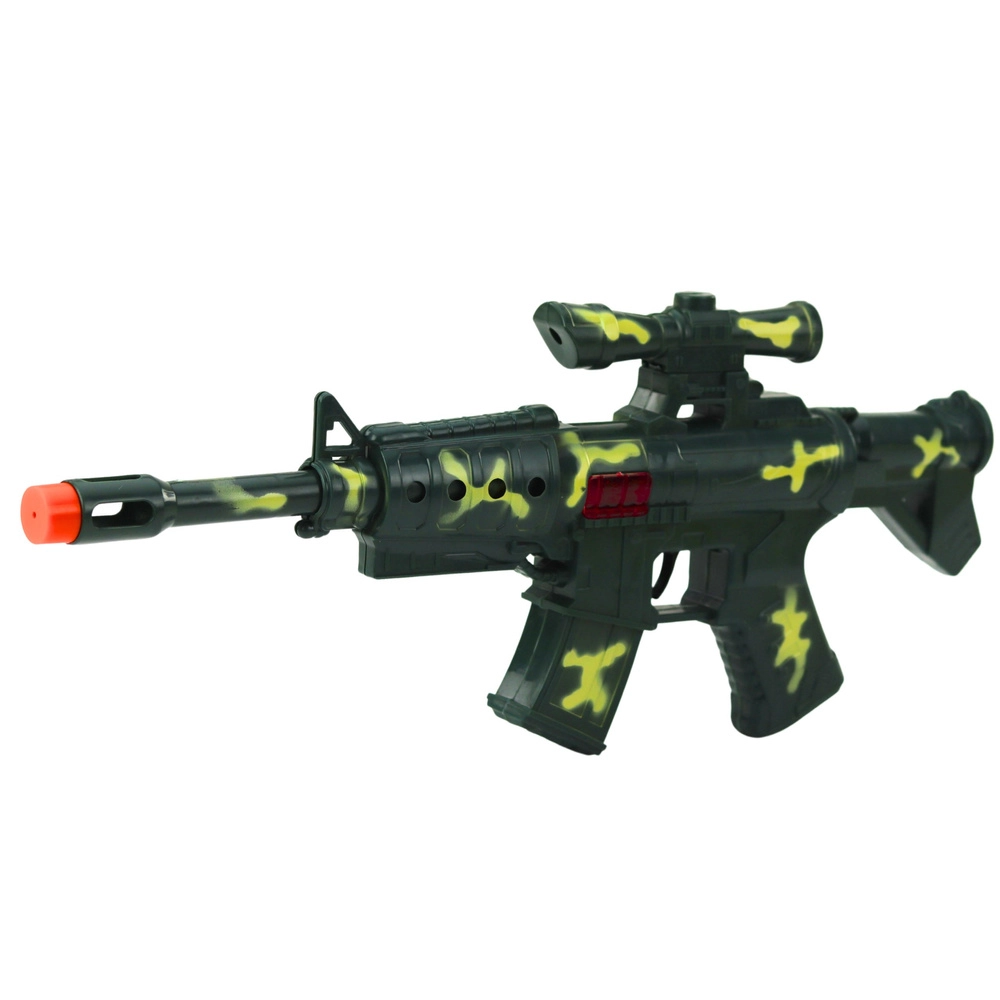 Al presionar el gatillo se oye un marcado efecto mecánico de disparo que intensifica la atmósfera del juego. La construcción de plástico con detalles de camuflaje es ligera y segura para los niños.