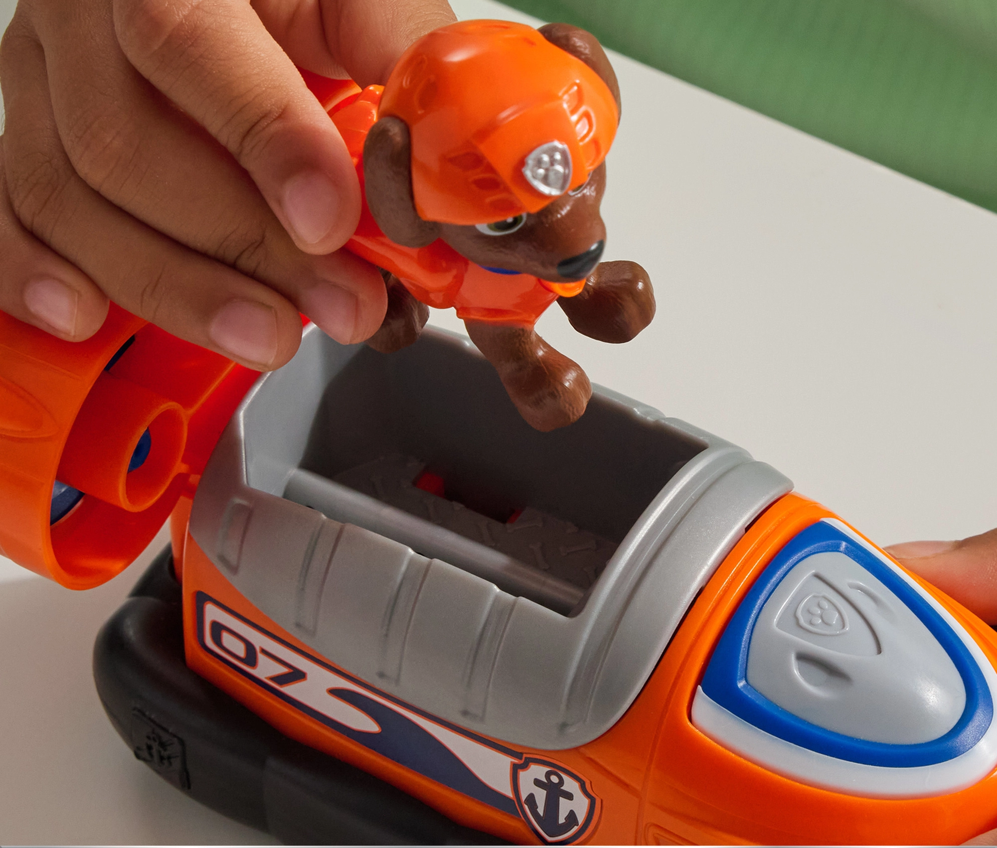 Emprende misiones de rescate acuático con Zuma, el socorrista de agua de PAW PATROL. El elegante aerodeslizador naranja y gris con ruedas móviles permite un movimiento fluido por el suelo, y la fiel figura de Zuma con equipo y casco naranjas preparará a los niños para horas de juego creativo.