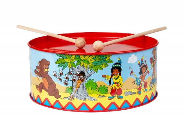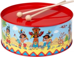Tambor infantil con motivo indígena y un diámetro de 20 cm que encantará a los pequeños músicos. Está fabricado en metal, complementado con tejido y dos baquetas de madera. Incluye una cuerda para colgarlo del cuello. Favorece el desarrollo de la coordinación, el ritmo y el amor por la música.