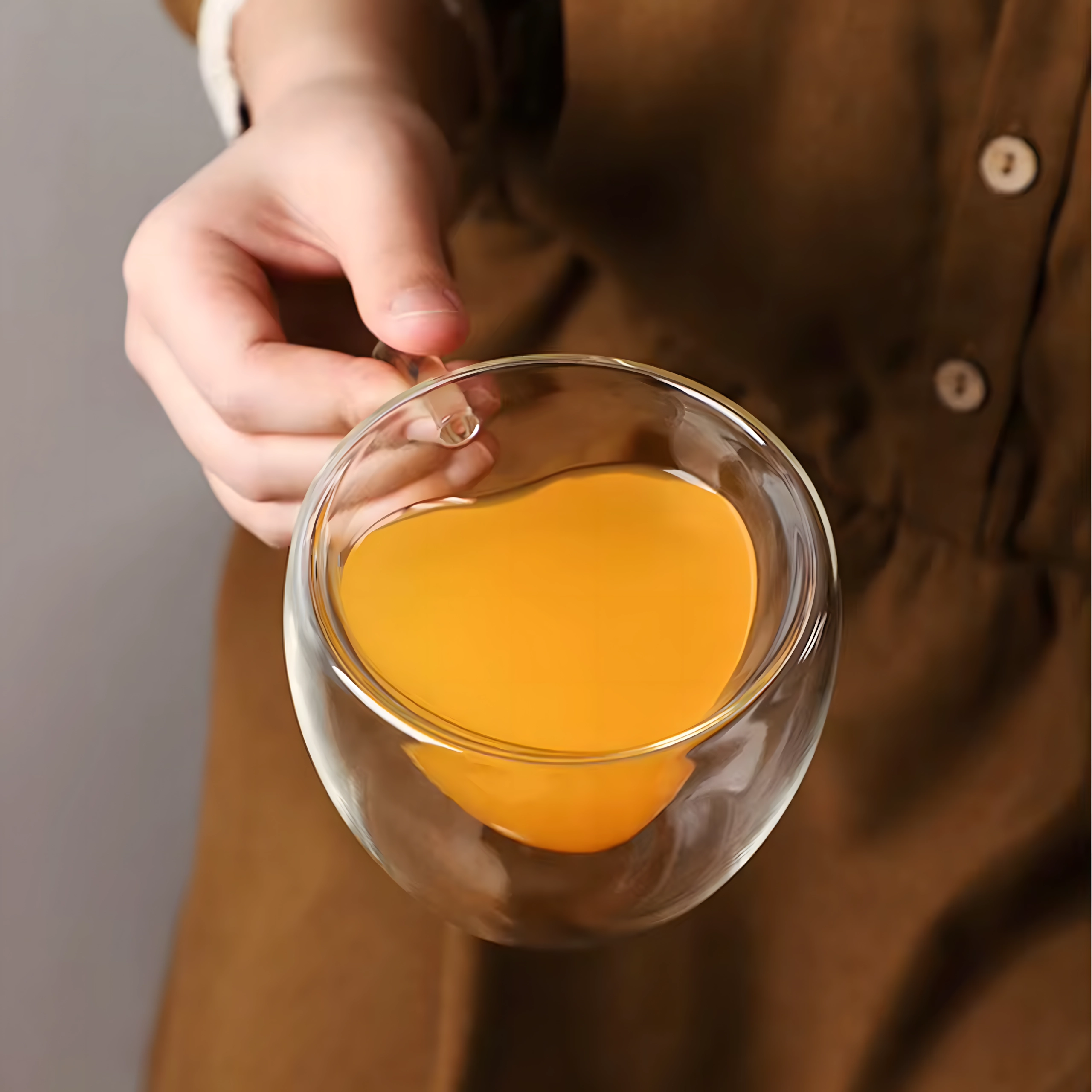 Añade un toque de romanticismo a tus momentos cotidianos. La taza transparente con cámara interna en forma de corazón realza el color de la bebida y ofrece un servicio con estilo. La doble pared reduce el empañamiento en bebidas frías y protege las manos del calor en café y té.