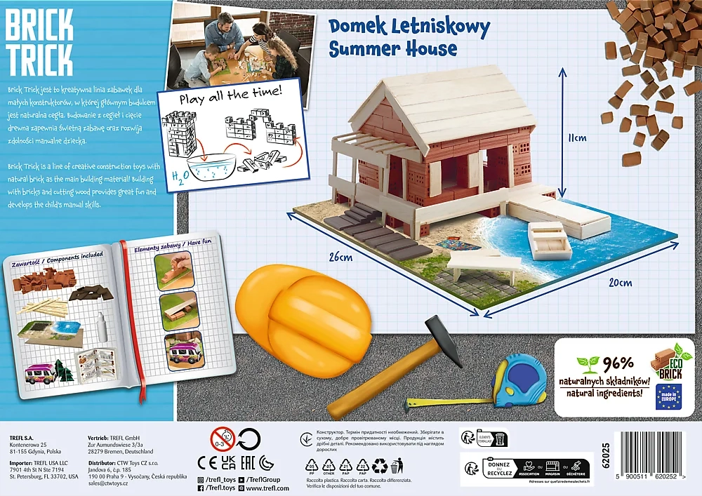 Descubre el mundo creativo de la construcción con el original set Trefl Brick Trick residencia de verano M. Con ladrillitos de arcilla reales y tablillas de madera construirás una casa paso a paso, y gracias al pegamento soluble podrás construir una y otra vez. El set desarrolla habilidades manuales, la imaginación y la concentración – diversión ideal para constructores pequeños y grandes.