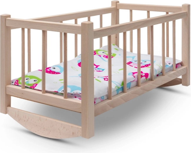 La cuna está hecha de madera natural con superficie lisa y sin bordes afilados. Su construcción estable resiste el juego diario y fomenta la imaginación y las habilidades de cuidado de los niños.