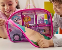 La caravana desplegable de unos 30 cm de largo se convierte, al abrirse, en una casita miniatura ricamente ilustrada con base de parque para picnic y descanso tras la misión. Los niños disfrutarán historias inspiradas en la serie gracias a las figuras de Skye, Liberty y Everest con cabezas oscilantes y extremidades articuladas.