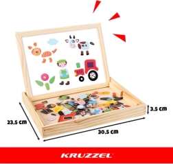 La creativa pizarra KRUZZEL de doble cara para niños a partir de 3 años combina una superficie magnética blanca para componer formas y escribir con rotulador con un lado de tiza negro para dibujar. El paquete incluye 108 piezas magnéticas de colores, rotulador de borrado en seco, tizas, esponja y una práctica caja de madera para guardarlo todo. Una gran ayuda para el desarrollo de la motricidad fina, el pensamiento lógico y la creatividad sin pantallas.