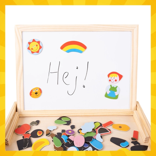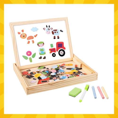 Descubre un juguete inteligente que crecerá con tu hijo. La pizarra de doble cara ofrece dos mundos de diversión: un lado blanco magnético para montar animalitos, figuras y vehículos y para escribir con rotulador de borrado en seco, y una superficie negra para tiza para dibujar libremente. Todo se guarda en una compacta caja de madera que también sirve como soporte.