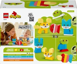 Este colorido set de construcción para niños pequeños incluye tres modelos sencillos de animales: un perrito, un gatito y un pajarito, hechos con ladrillos grandes y fáciles de manipular. Cada animal está formado por piezas de un solo color, lo que fomenta el aprendizaje de los colores y la clasificación. Las expresiones amistosas en los ladrillos impresos estimulan la imaginación y la narración de historias.