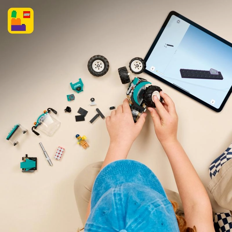 Construir es fácil y divertido con la app LEGO Builder, donde se puede acercar y girar el modelo en 3D y seguir el progreso. Los niños desarrollan motricidad, imaginación y juego narrativo mientras disfrutan de elementos realistas de la maquinaria agrícola.