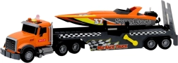 El detallado camión naranja con remolque y rampa de acceso permite cargar la lancha fácilmente y transportarla fielmente hasta las competiciones.