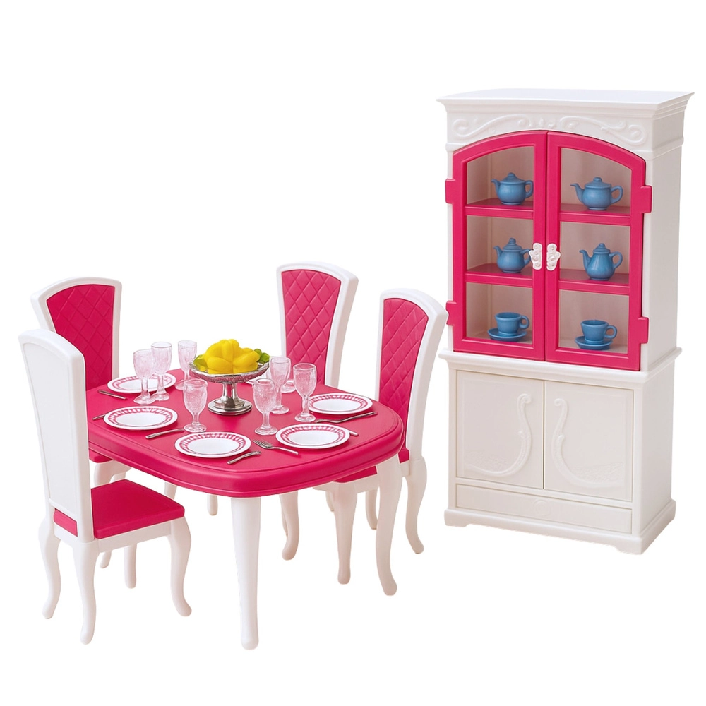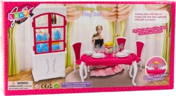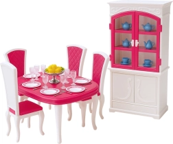 Elegante set de muebles y accesorios para muñecas de aprox. 29 cm que convierte cualquier casita en un comedor realista. Incluye mesa, sillas, aparador con puertas abatibles y un completo menaje de mesa. Resistente fabricación en plástico, combinación rosa‑blanco y estilo clásico que fomentan el juego creativo, el desarrollo de habilidades sociales y escenas de roles. Cumple con las normas CE y EN71.