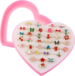 Este colorido set de anillos encantará a todas las pequeñas coquetas. Gracias al diámetro ajustable, los anillos se adaptan fácilmente a los deditos infantiles y ofrecen un uso cómodo y seguro. La tapa transparente del estuche en forma de corazón permite un almacenamiento ordenado y una rápida elección de los motivos favoritos.