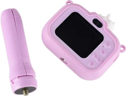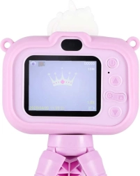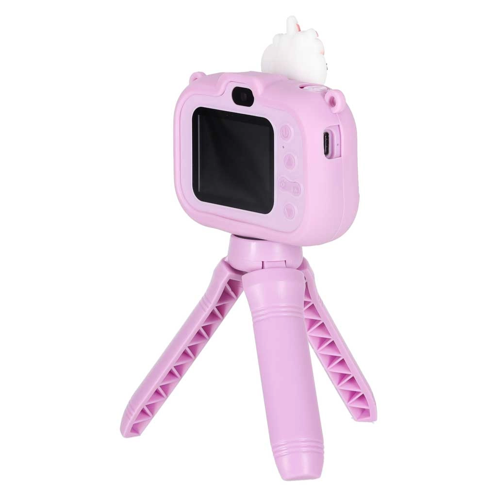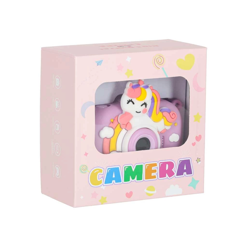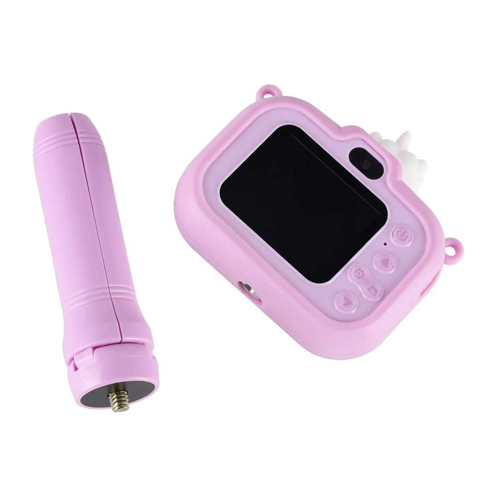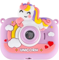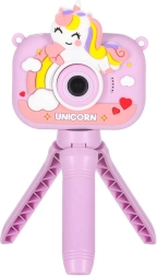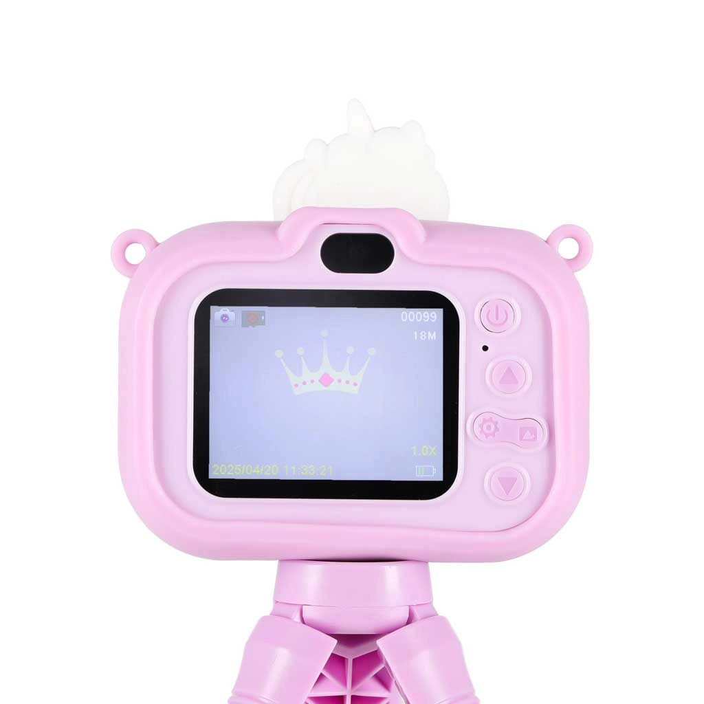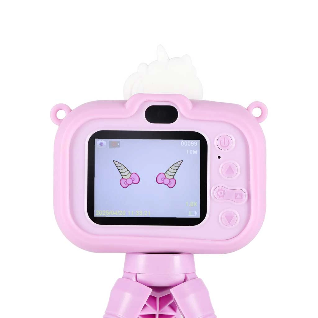 Adorable cámara infantil con diseño de UNICORNIO y mini trípode estable que encantará a pequeños fotógrafos desde 3 años. Ofrece doble objetivo para hacer fotos y selfies con facilidad, grabación de video Full HD 1080p, una pantalla IPS de 2,0" clara, hasta 4 horas de autonomía y funda de silicona para un agarre seguro. El paquete incluye correa ajustable y cable USB para la carga.