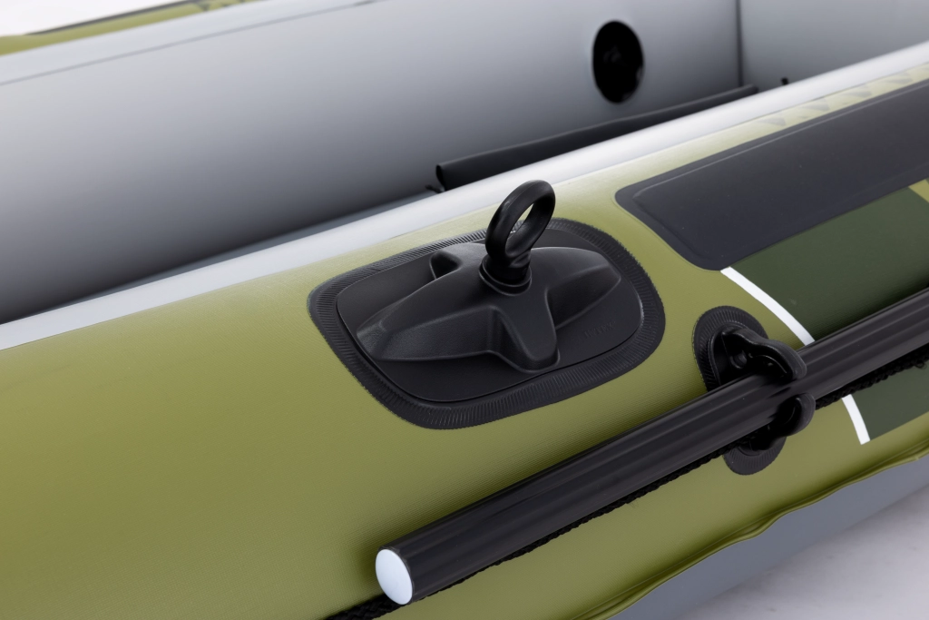 Para facilitar la manipulación, la embarcación está equipada con cuerda perimetral y asa soldada en la proa. El inflado y desinflado rápidos los proporcionan las válvulas Boston. El equipamiento práctico se completa con bloqueos giratorios de los remos, portacañas de pesca, bolsillo/funda interior para pequeños objetos y puntos de montaje para motor auxiliar.