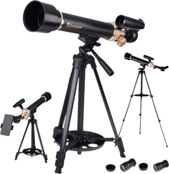 Este telescopio refractor combina una robusta construcción de aluminio con enfoque suave y regulación de inclinación para una observación cómoda y precisa. Gracias al trípode de altura ajustable (hasta 1,35 m), es adecuado para jóvenes entusiastas y adultos, tanto para astronomía nocturna como para observación diurna de paisajes y naturaleza.