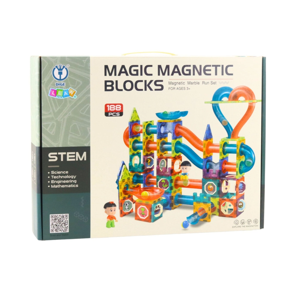 Descubre un mundo creativo con el set de construcción magnético con pista de canicas de 188 piezas, que fomenta el pensamiento lógico, la motricidad fina y la imaginación espacial. Gracias a los imanes potentes y a los elementos transparentes y coloridos, los niños pueden construir fácilmente estructuras de varios niveles y recorridos dinámicos para canicas: diversión y aprendizaje ideales para niños a partir de 3 años.