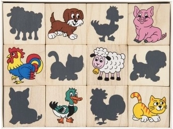 Pexeso de fichas de madera con impresión de animales y sus sombras. Ayuda de forma divertida a desarrollar la imaginación y la memoria de tus hijos.