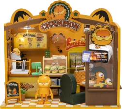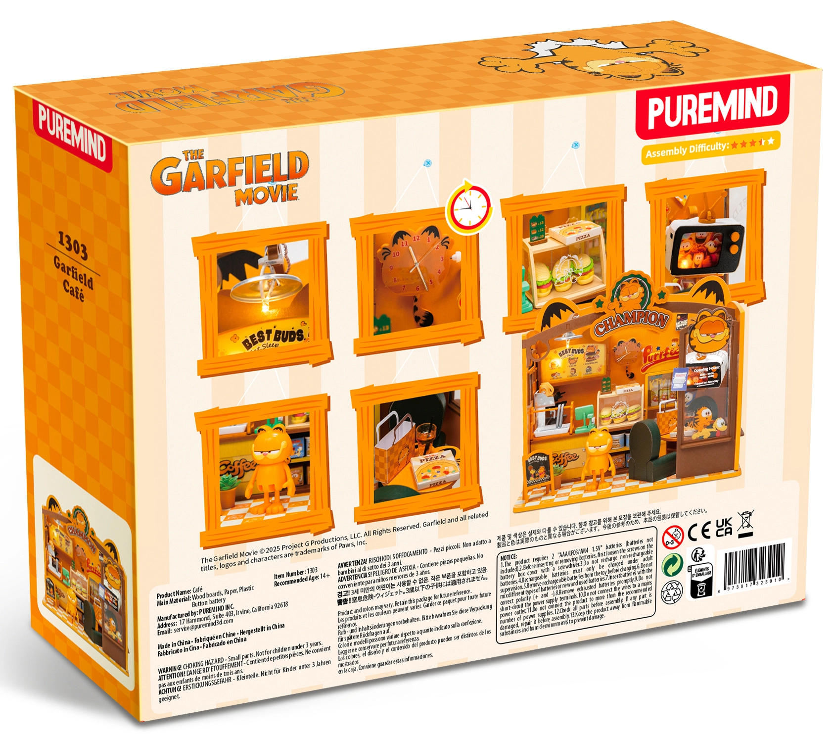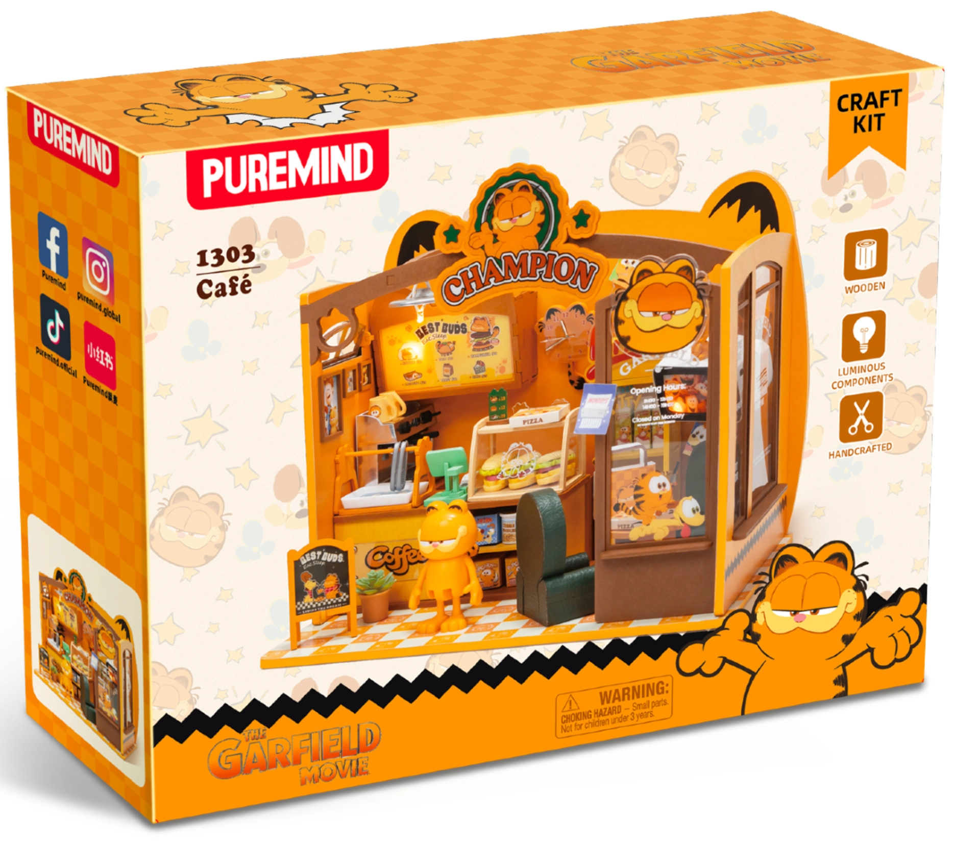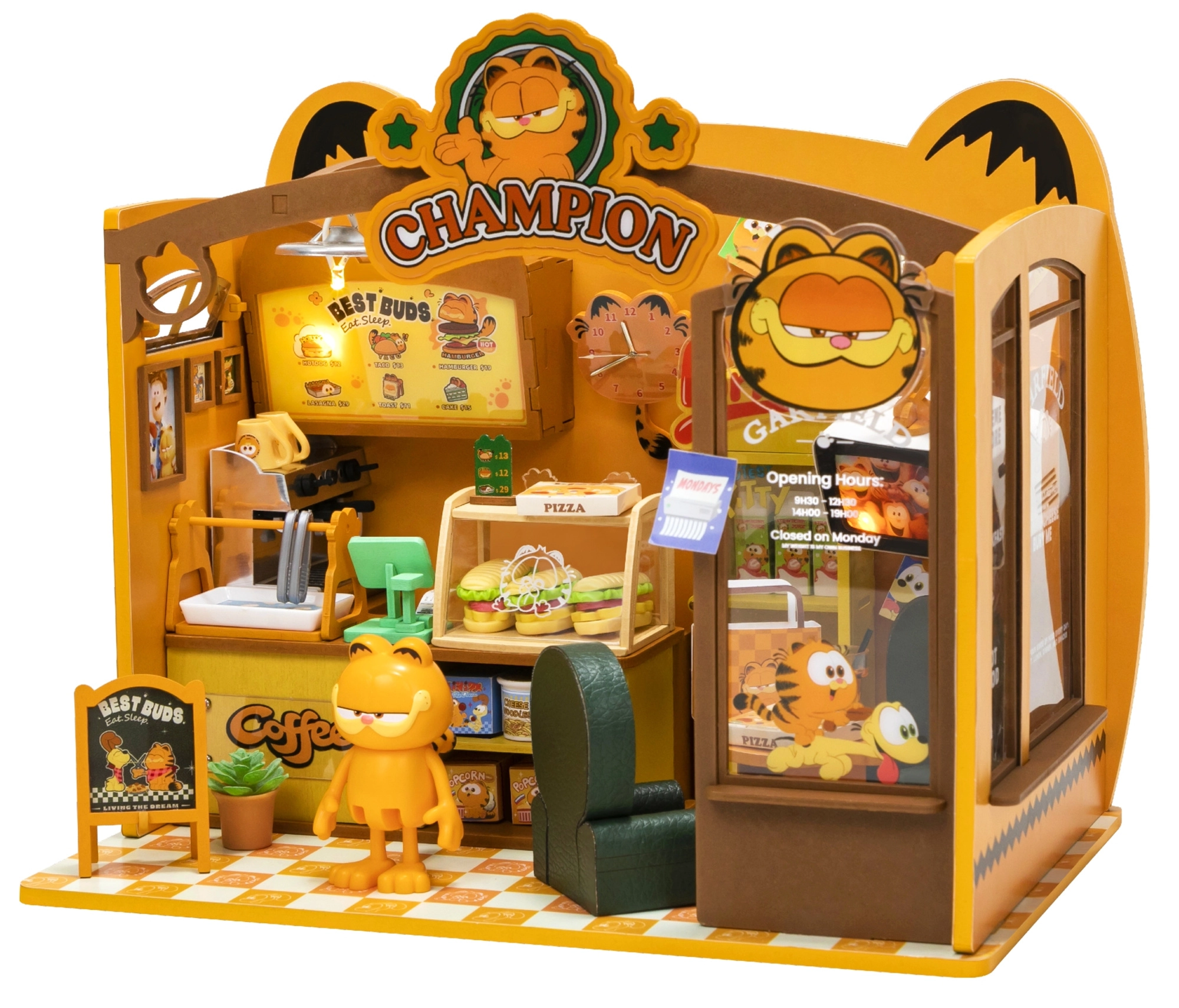 Este detallado set de madera representa una acogedora escena de cafetería inspirada en la película The Garfield Movie. Las piezas finamente cortadas encajan con precisión y crean un diorama decorativo con característicos detalles de interior. La iluminación LED integrada realza la atmósfera y convierte el modelo terminado en un llamativo complemento para una estantería o un escritorio.