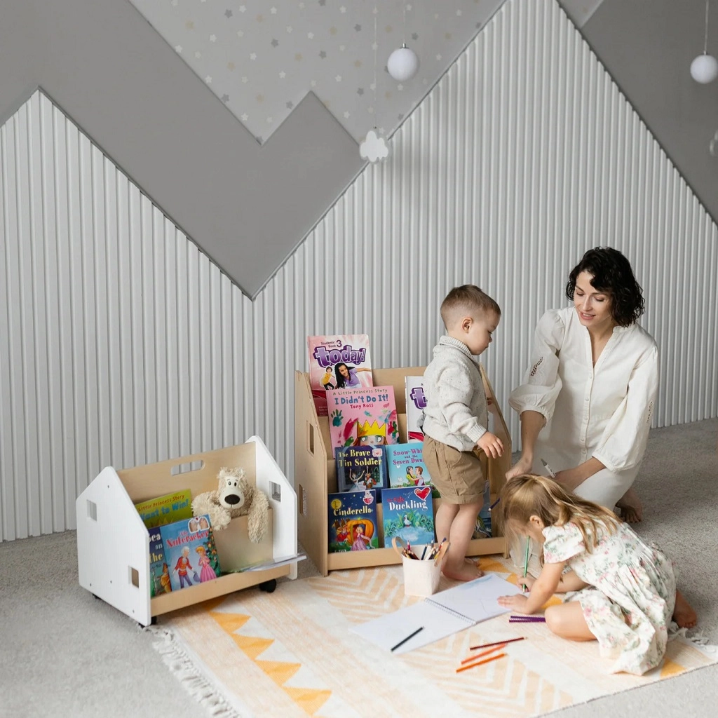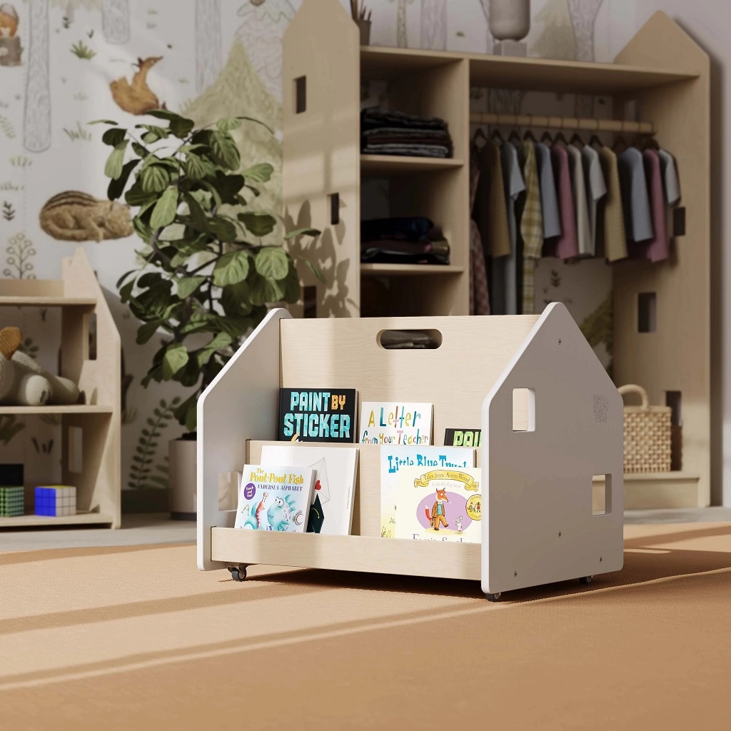 Los libros se exponen de frente para que los niños vean inmediatamente las portadas y puedan elegir por sí mismos. Fomenta los hábitos de lectura y una organización clara.