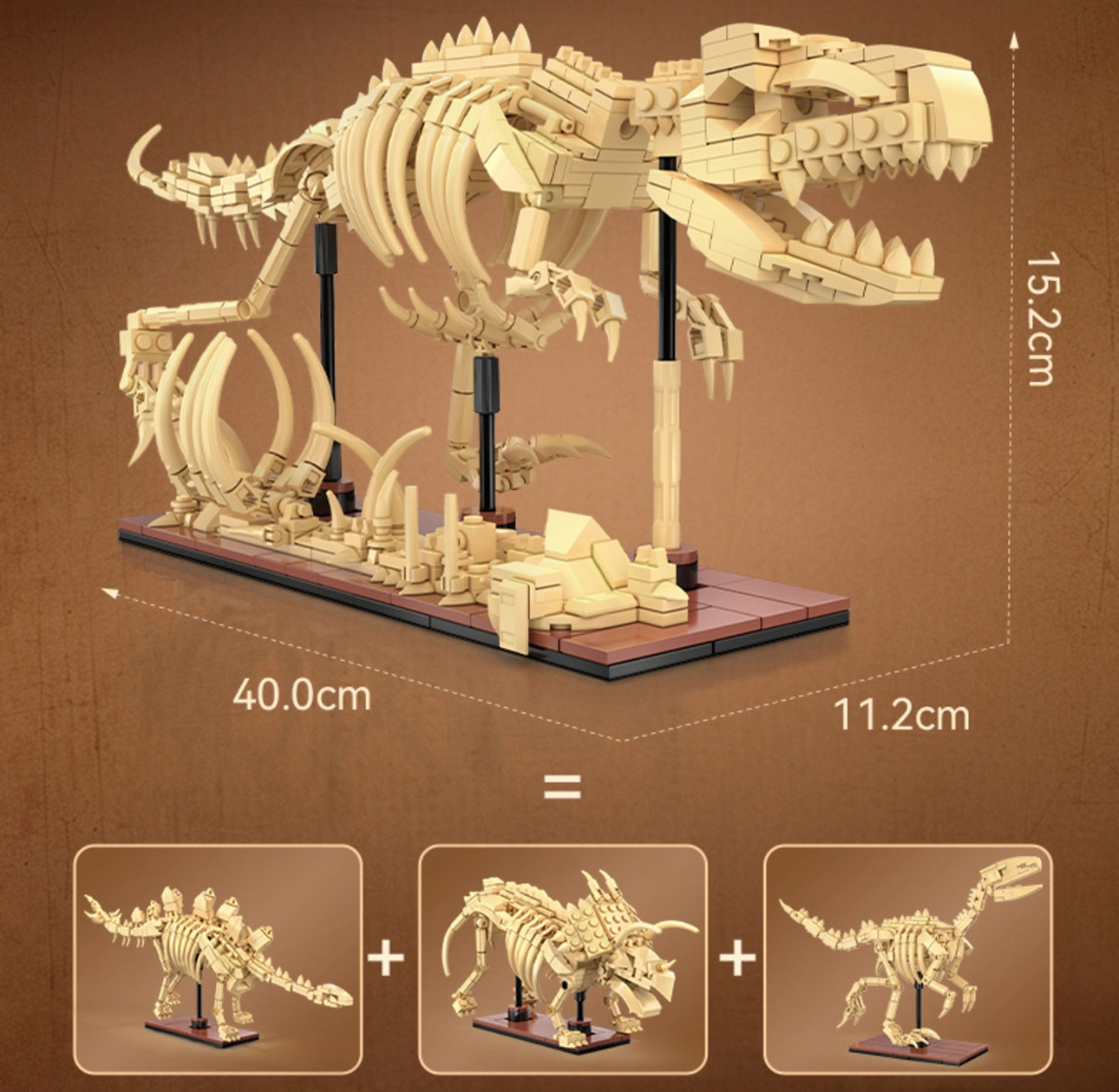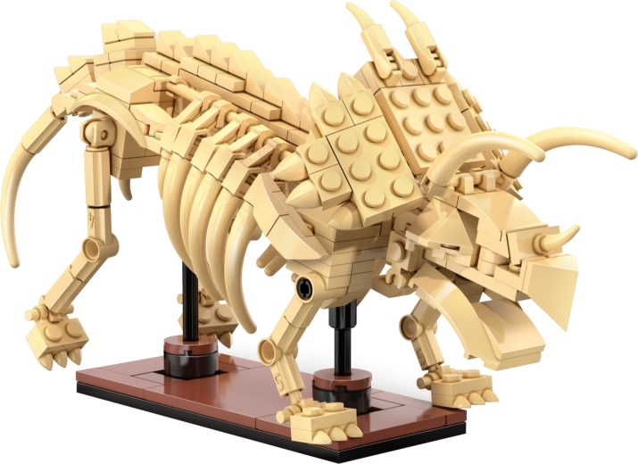 Construye los esqueletos detallados de Triceratops, Stegosaurus y Velociraptor con 825 piezas y exhíbelos en sus soportes. Cada modelo tiene articulaciones móviles para poses dinámicas.