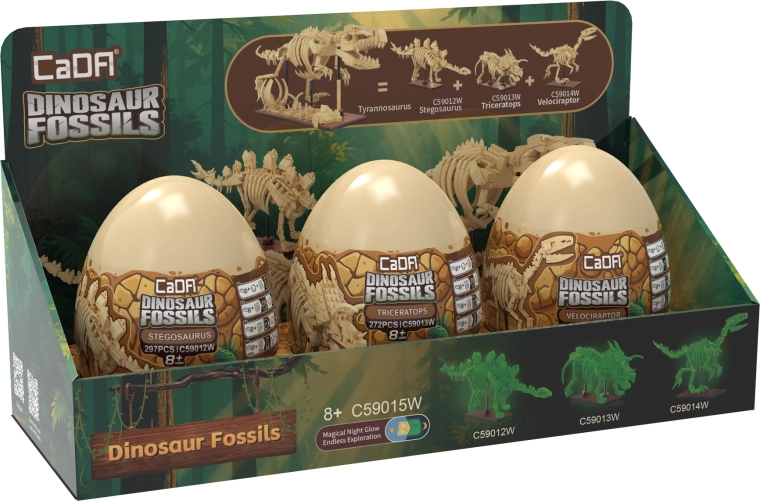 El set de construcción CaDA Dinosaur Fossils encantará a pequeños y grandes fans de la prehistoria y de los modelos educativos. Con piezas de alta calidad crearás tres impresionantes exposiciones esqueléticas con extremidades, cola y mandíbula articuladas, que podrás colocar en distintas poses. El material especial de los huesos brilla en la oscuridad, convirtiendo los modelos en una decoración original también de noche.