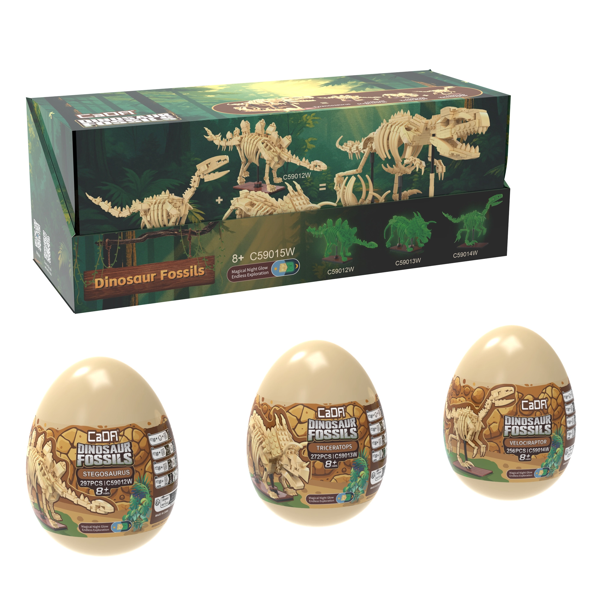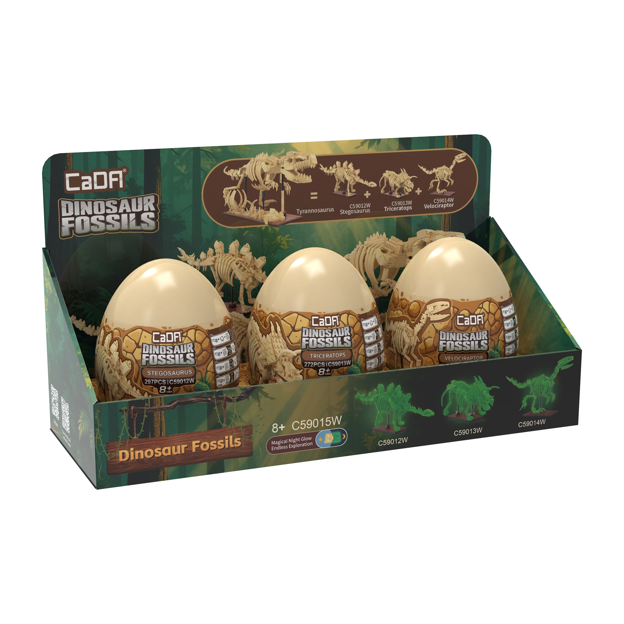 Descubre el fascinante mundo de los dinosaurios con el set de construcción CaDA Dinosaur Fossils. Construye tres detallados modelos de esqueletos: Triceratops, Stegosaurus y Velociraptor, y combínalos después para crear un imponente TYRANNOSAURUS REX. Las piezas tienen efecto luminoso en la oscuridad, las articulaciones son móviles y el set incluye un total de 825 piezas compatibles en prácticos “huevos” de coleccionista.
