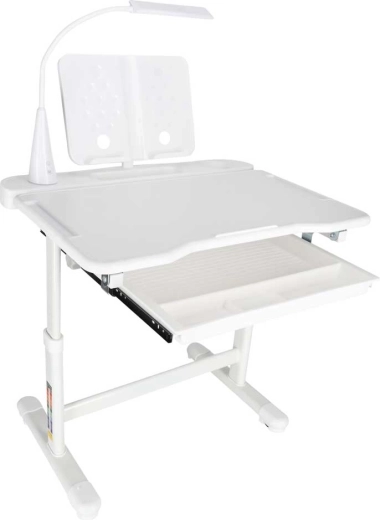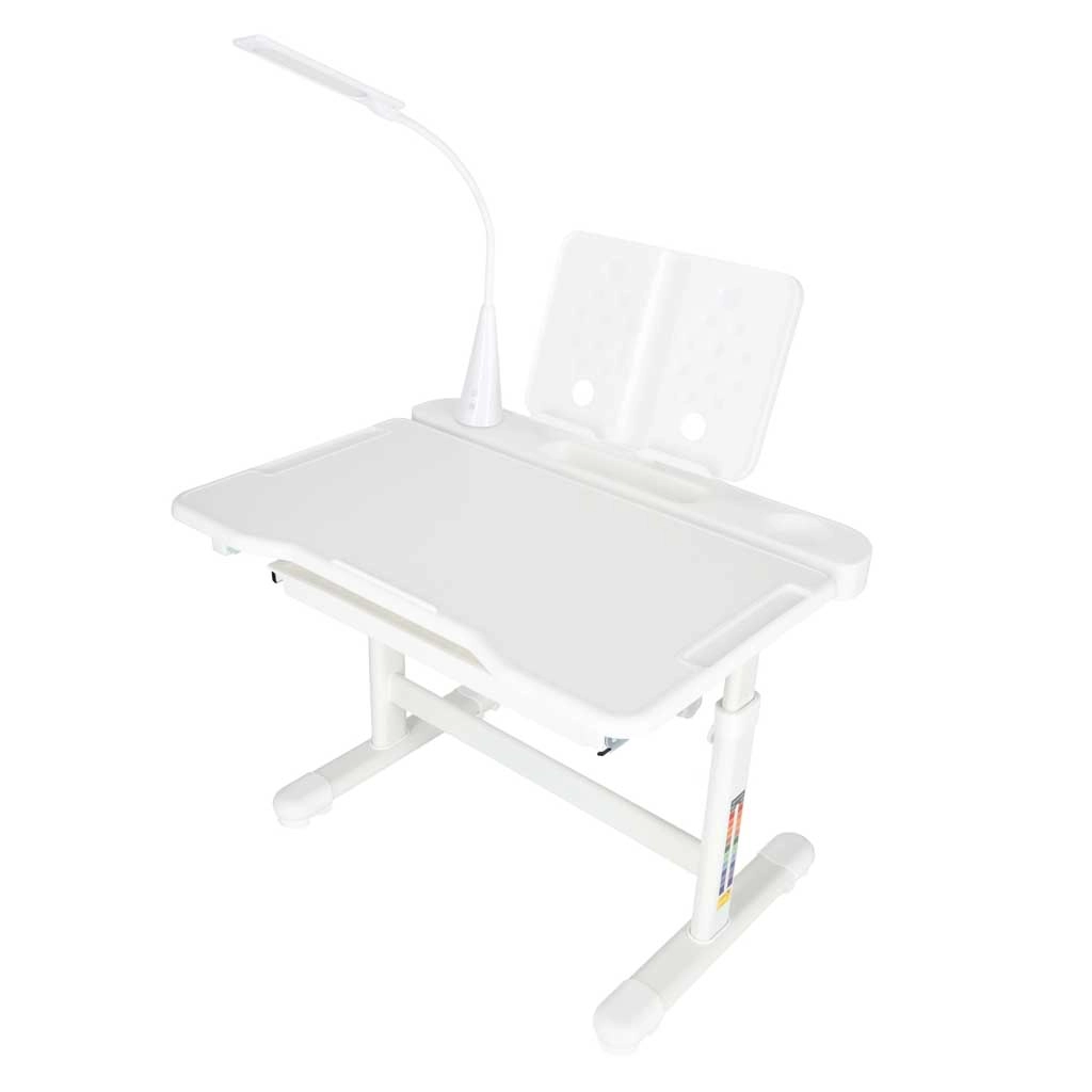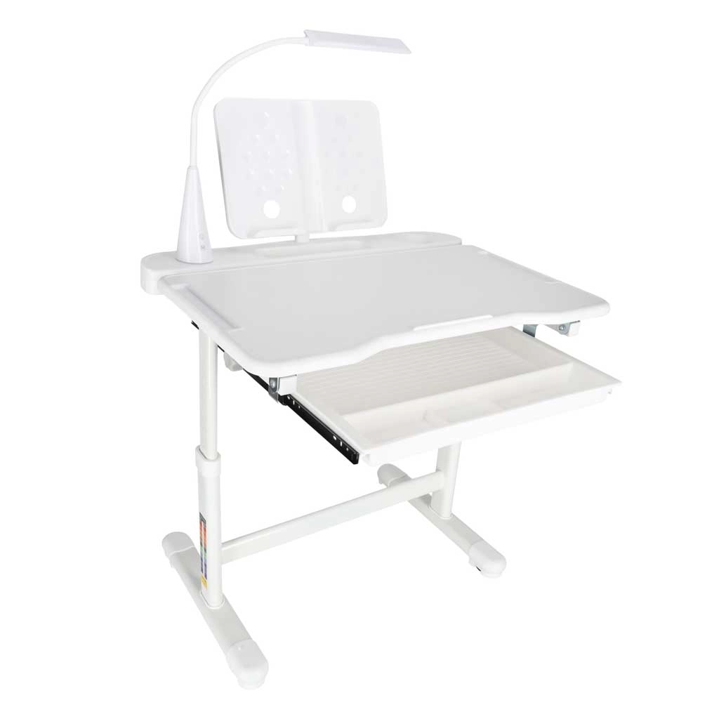 La lámpara LED integrada alimentada por USB ofrece 3 tonos de luz (cálida, fría, mixta) y 3 niveles de brillo para una iluminación ideal en cualquier momento. Un amplio cajón extraíble con compartimentos y un soporte para libro/tableta mantienen los útiles ordenados y a mano. Los bordes redondeados y la sólida estructura de metal, MDF y plástico garantizan estabilidad y durabilidad.