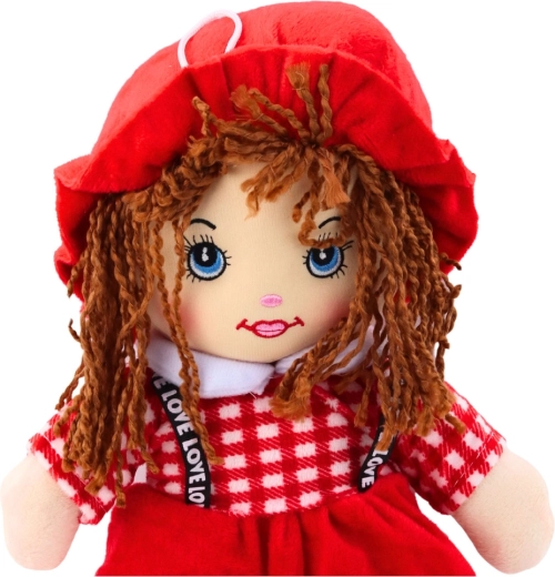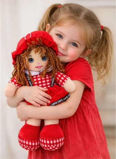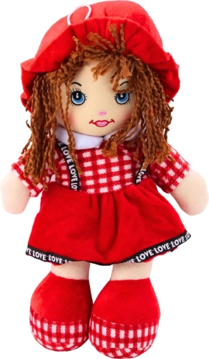 Esta suave muñeca cosida, con vestido rojo de pequeño estampado de cuadros, encantará a cualquier niño. Gracias a su relleno mullido y cuerpo textil, es segura desde las primeras etapas. Los detalles faciales bordados, el cabello tejido y el sombrerito y zapatitos a juego aportan encanto y una expresión amistosa.