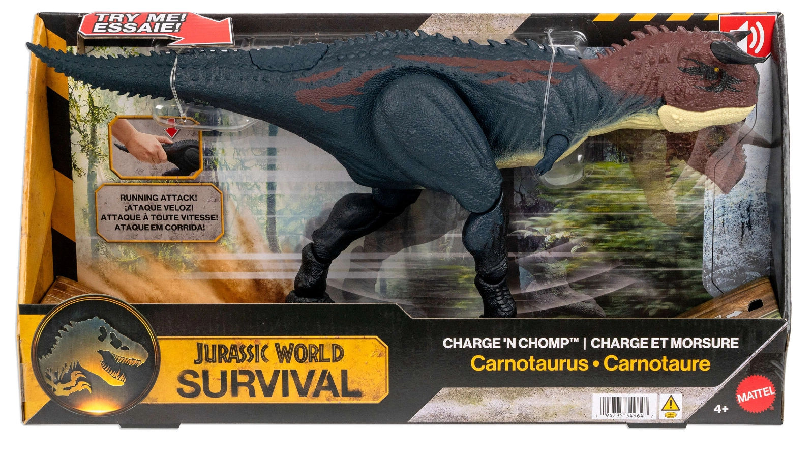Descubre el juego de acción con dinosaurios gracias a la figura Jurassic World Carnotaurus de aproximadamente 20 cm de altura. Ofrece movimiento interactivo, rugidos, mandíbulas articuladas y un aspecto cinematográfico detallado. Al pulsar el botón de la cola se activa una carrera realista con patas en movimiento y acción de “mordida”, que estimula la imaginación y relatos dinámicos.