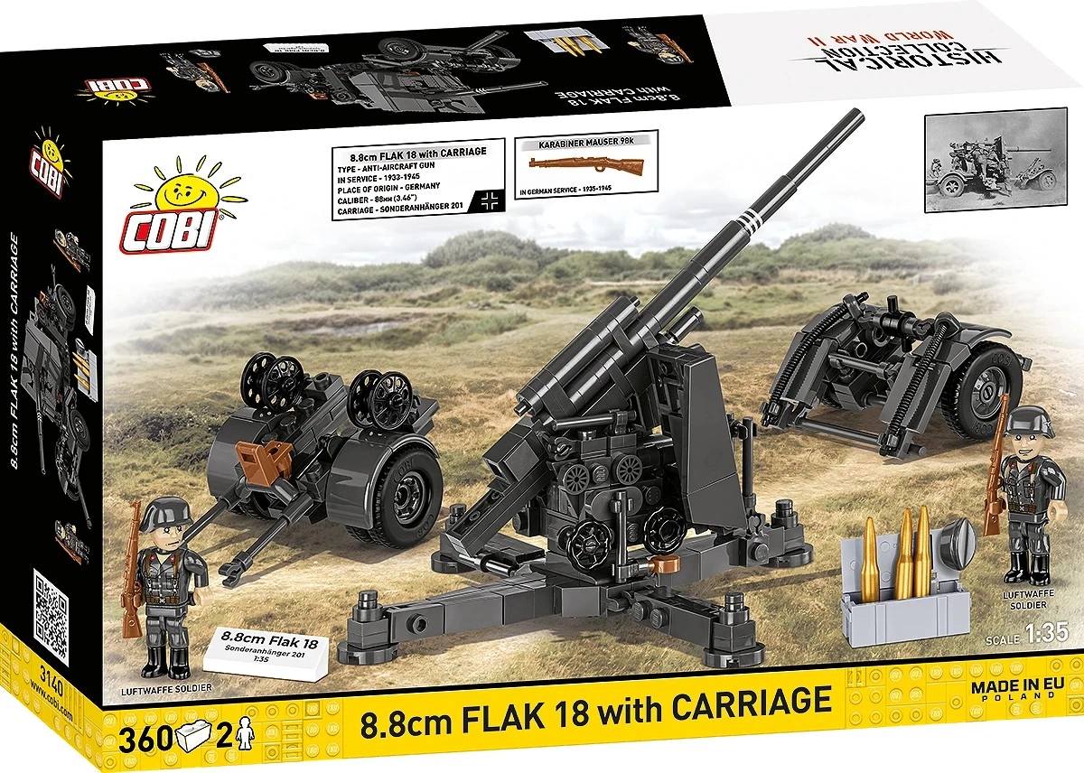 Esta versión clásica del famoso cañón 8,8 cm FLAK 18 ofrece un modelo auténtico con detalles elaborados y funciones para exhibir y jugar. Gracias a la cureña en cruz, permite un giro rápido de 360° y un apuntado realista, resaltando la elegancia técnica de este icono histórico de la Segunda Guerra Mundial.