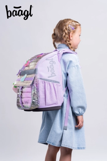 El equipamiento escolar completo en el diseño unificado Lavender combina comodidad, seguridad y una organización bien pensada. La cartera ergonómica BAAGL Zippy con sistema deslizante ERGO ADJUSTABLE se adapta a la complexión del niño y, gracias al cuerpo reforzado, base rígida y material resistente al agua, aguanta incluso los días escolares exigentes. Incluye un estuche espacioso, bolsa con cordón para educación física, monedero para pequeños objetos y chaleco/delantal protector para proyectos escolares.