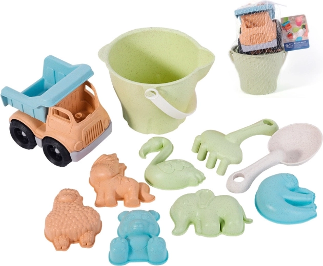 - cubo, regadera, camión volquete, 2× pala, 4× molde