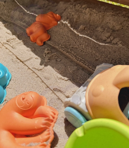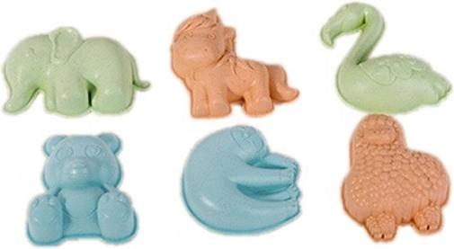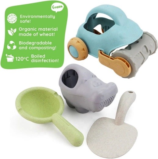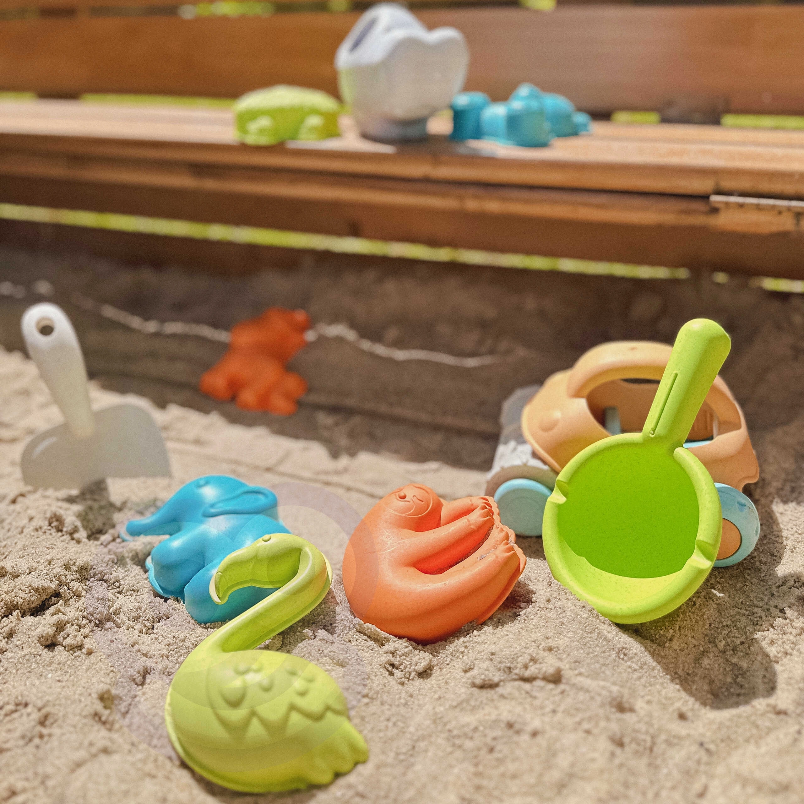 El material a base de fibras vegetales es ecológico, biodegradable y apto para compostaje. El set es fácil de lavar y, gracias a los agarres ergonómicos, los niños lo manipulan con facilidad. Adecuado para jugar al aire libre y en casa con arena cinética.