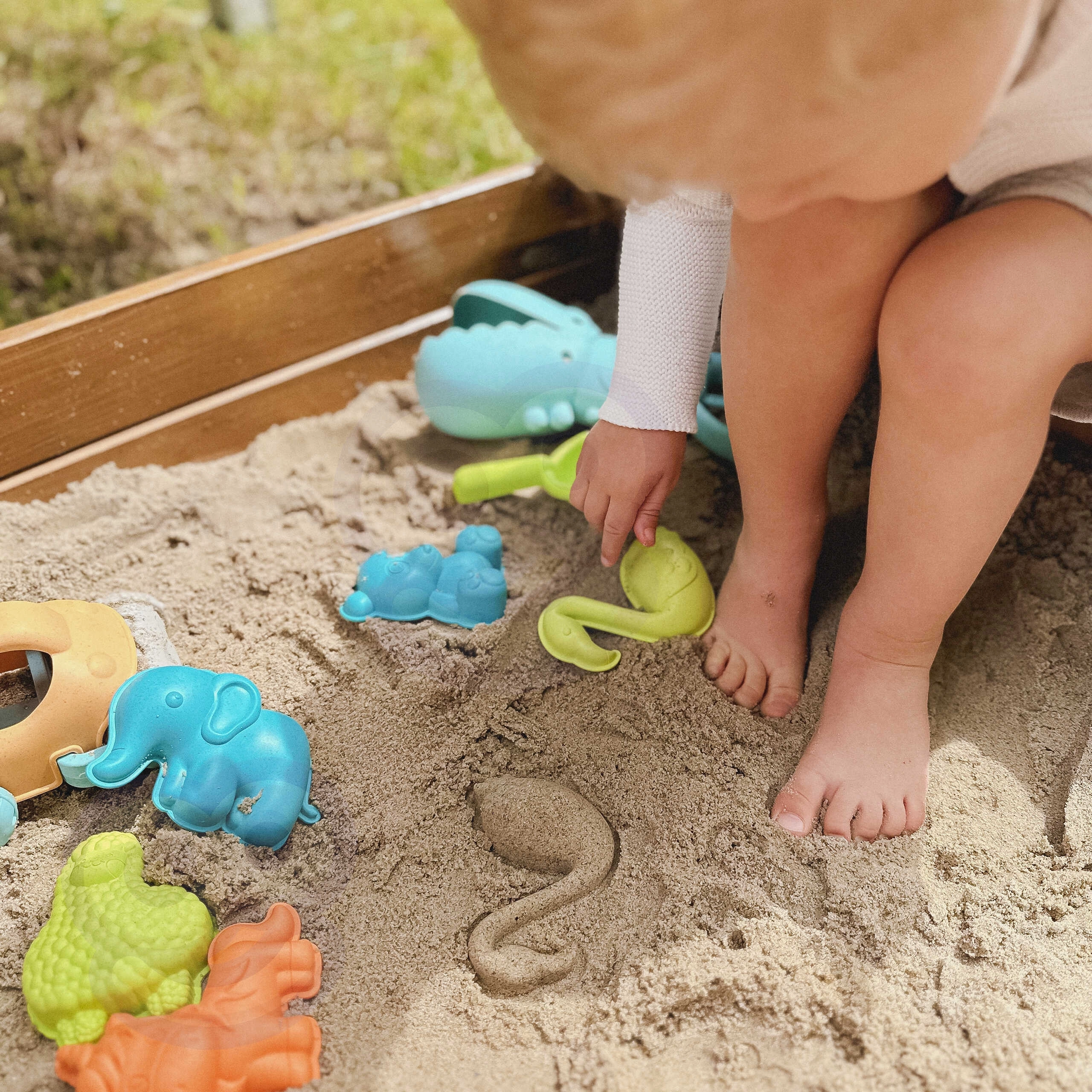 Los variados moldes de animales, palas y tamiz estimulan la imaginación y desarrollan la motricidad fina al construir, verter y dar forma a la arena.