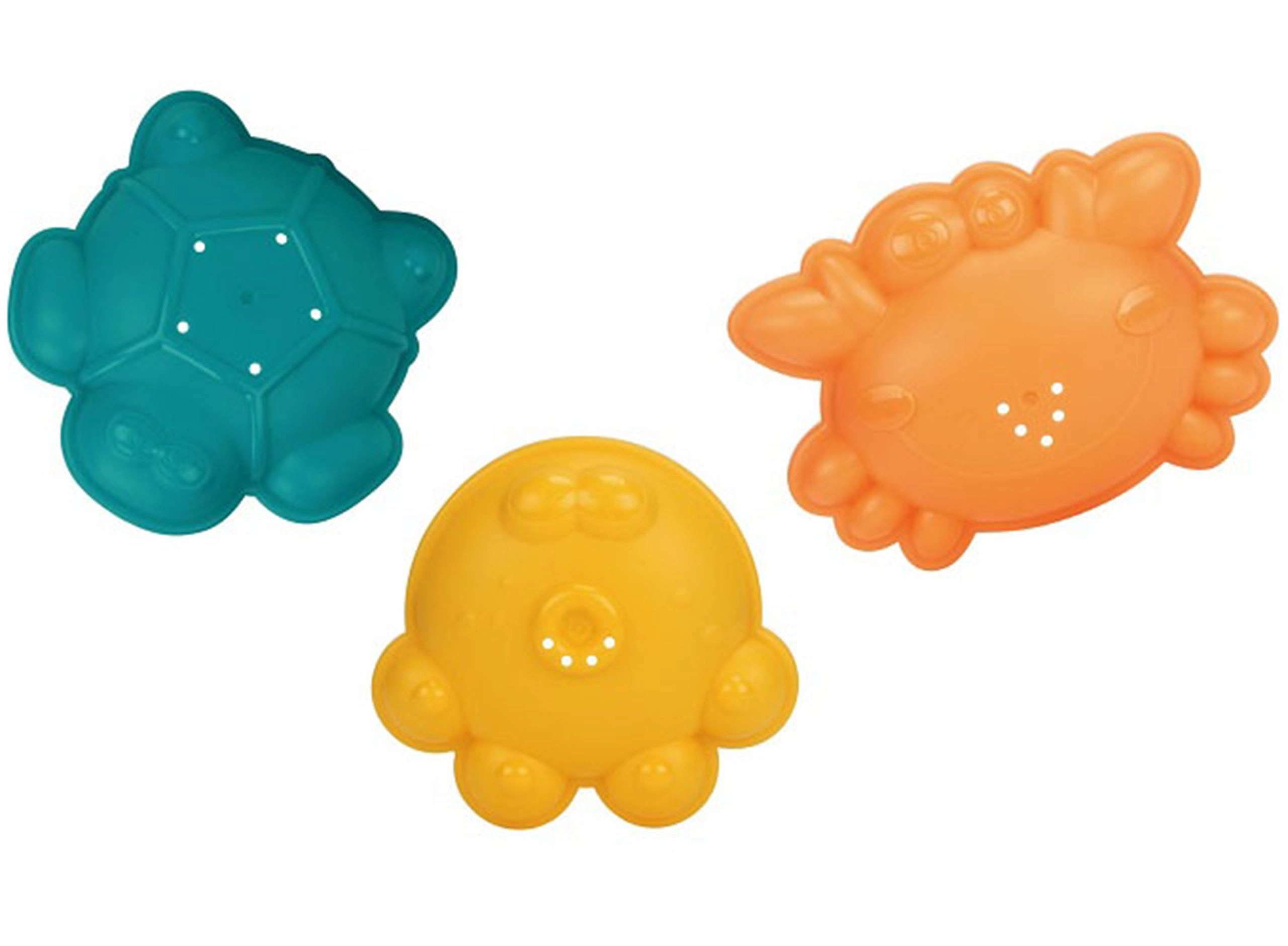Tres moldes de colores estimulan la imaginación y la creatividad en la arena y en el agua. Los niños pueden formar fácilmente una tortuga, un cangrejo o un pulpo.