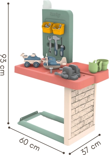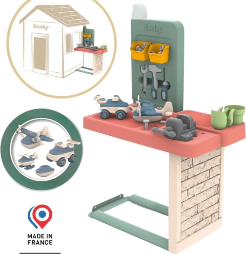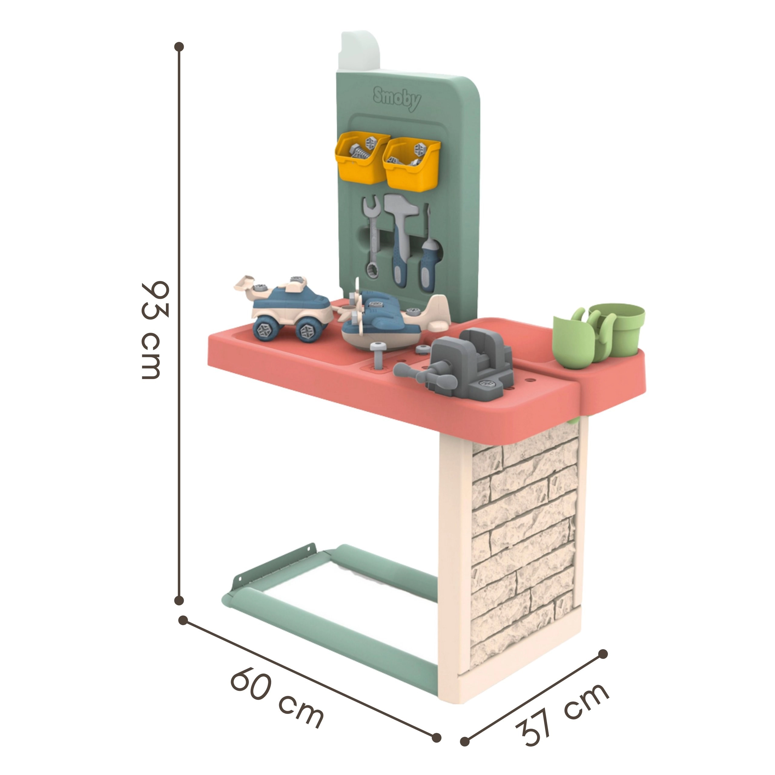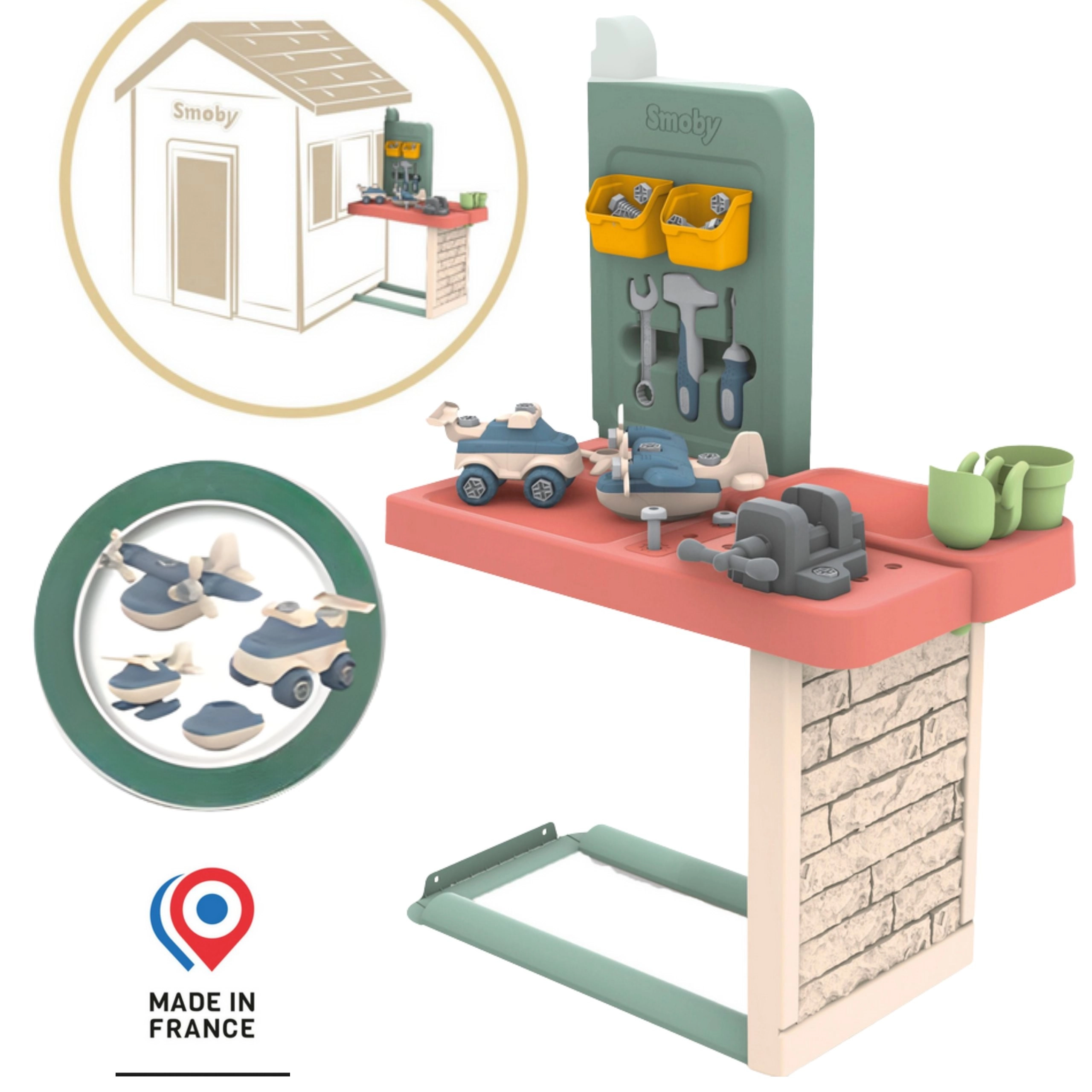 Esta mesa auxiliar de taller es el complemento ideal para las casitas modulares SMOBY Life. Gracias a su organización bien pensada y a su completo juego de herramientas, permite a los niños descubrir el mundo del bricolaje con seguridad, desarrollando la motricidad fina, la coordinación y el pensamiento lógico. La amplia superficie de trabajo y los estantes de almacenamiento mantienen todo en su sitio para que el juego sea claro y divertido.