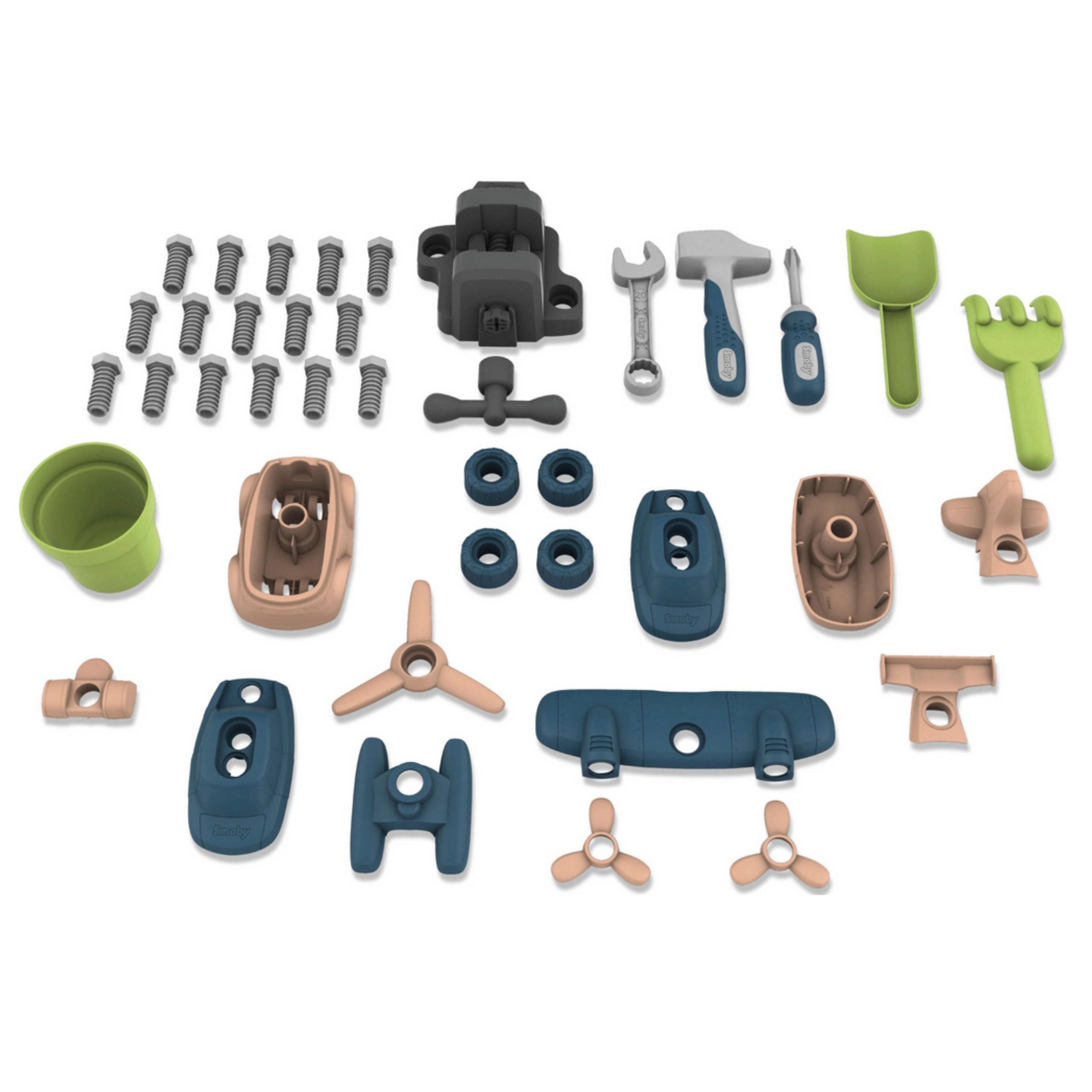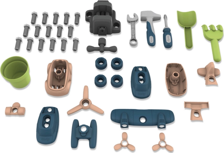 Incluye 39 elementos entre martillo, destornillador, llaves y material de fijación. Los niños pueden montar por sí mismos un coche y un helicóptero, entrenando la paciencia, la precisión y el sentido de logro. El material es resistente, estable frente a los rayos UV y con un alto contenido de reciclado, perfecto para un uso prolongado en el jardín o en casa.