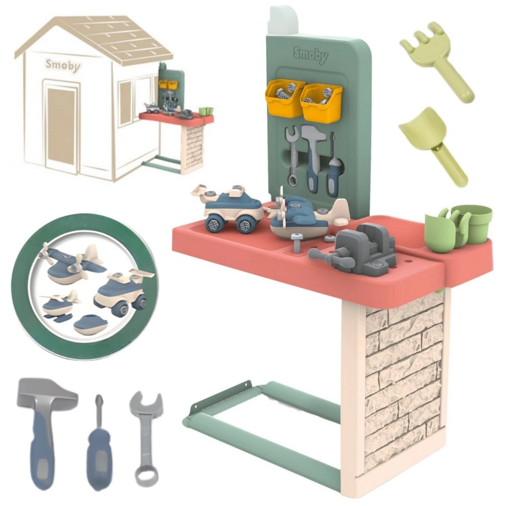 Amplía la casita infantil SMOBY Life con un práctico set de taller con mesa auxiliar y 39 piezas de herramientas y accesorios. Los pequeños manitas a partir de 2 años disfrutarán de un montaje seguro, construcción y aprendizaje de nuevas habilidades. Incluye una superficie de trabajo espaciosa, estantes para almacenamiento y modelos para montar: coche y helicóptero. La estructura es resistente a los rayos UV y está fabricada con un alto porcentaje de materiales reciclados para una diversión duradera tanto en exterior como en interior.