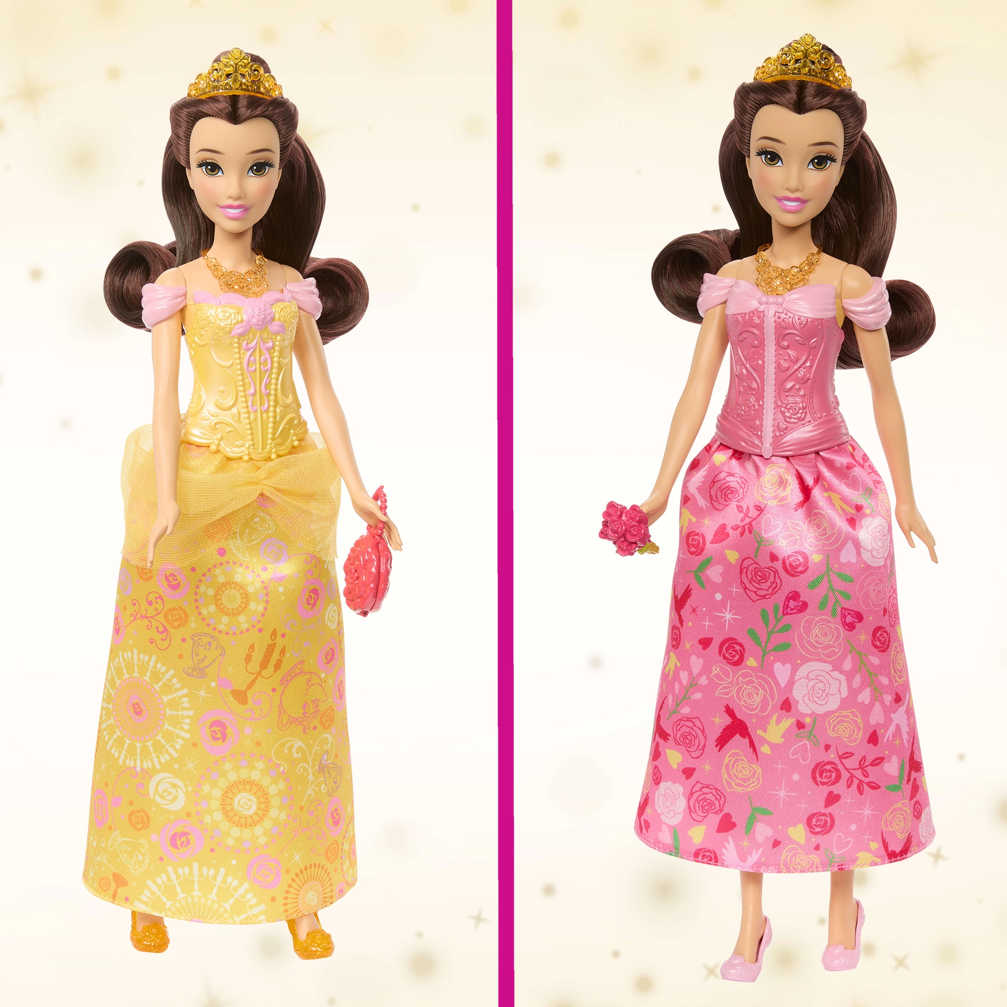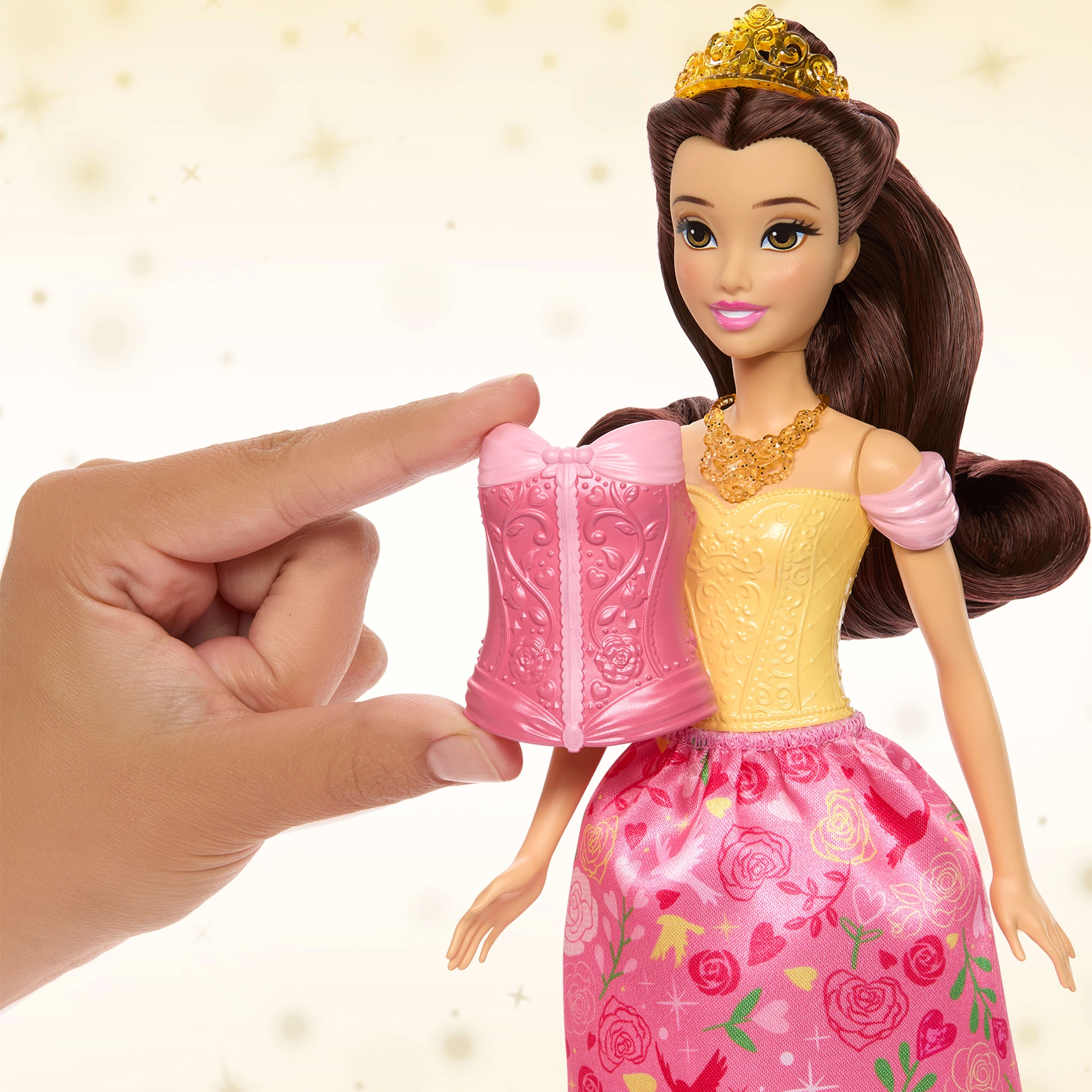 Descubre el mundo mágico del cuento con la muñeca Bella inspirada en Disney La Bella y la Bestia. Obtén 2 estilos en 1: un elegante baile y una acogedora hora del té. Incluye 2 corsés intercambiables, 2 faldas de tela, cabello largo para peinar, tiara y accesorios temáticos. Gracias a los puntos de articulación, es fácil colocar a Bella en diferentes poses para un juego creativo.