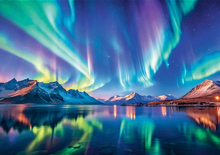 - Motivo: aurora boreal sobre paisaje nórdico
